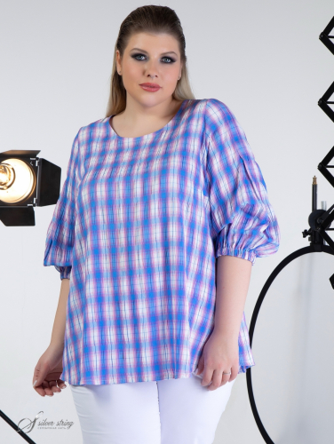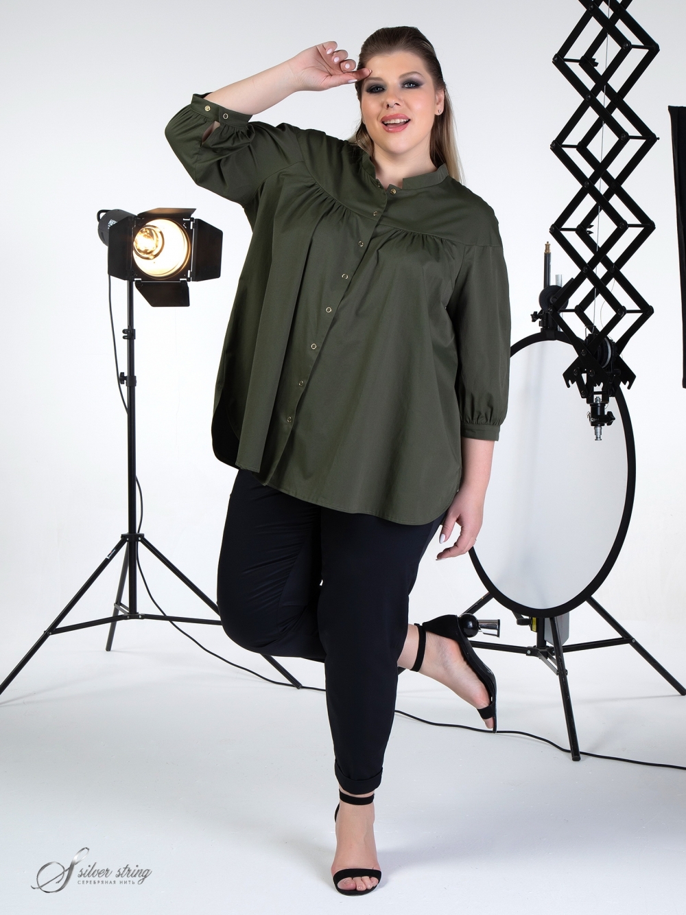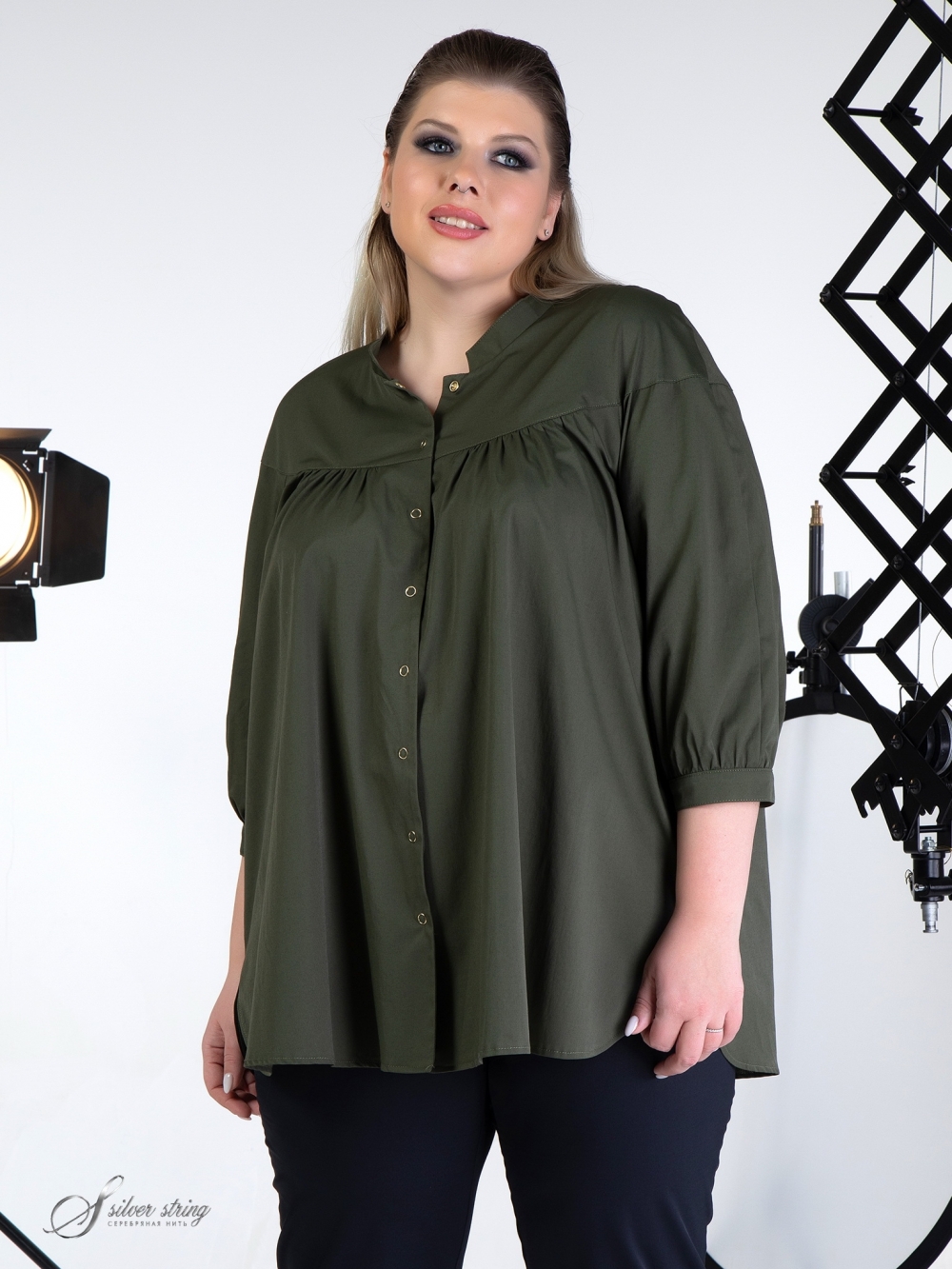 Блуза трапециевидного силуэта с воротником – стойкой и застежкой на кнопки. Модель выполнена из эластичной ткани с высоким содержанием хлопка. Особого внимания заслуживает отличное качество ткани. Переплетение нитей в полотне, придает материалу шелковистость и легкий блеск. По полочке и спинке проходит отрезная кокетка, переходящая на окат рукава. От линии кокетки, по центру спинки и на полочке, заложена легкая сборка. Рукав, длиной 3/4, обработан манжетой. Объем манжеты можно регулировать за счет парных кнопок. Это оригинальная модель, которая прекрасно впишется в Ваш гардероб и подарит настроение и комфорт.