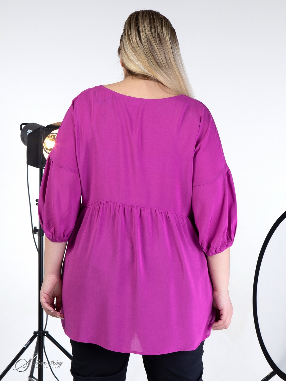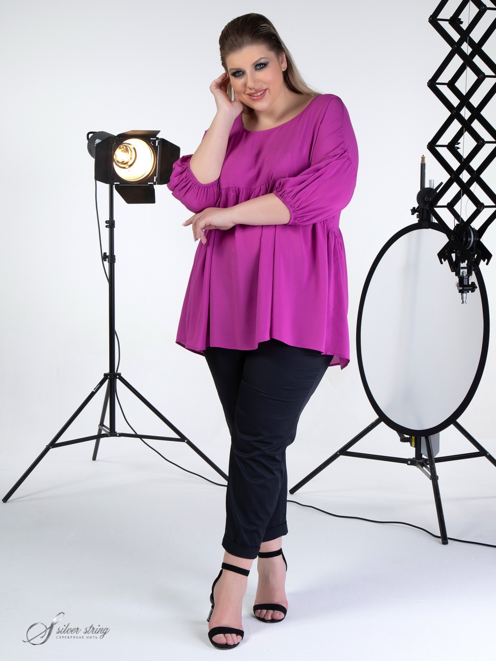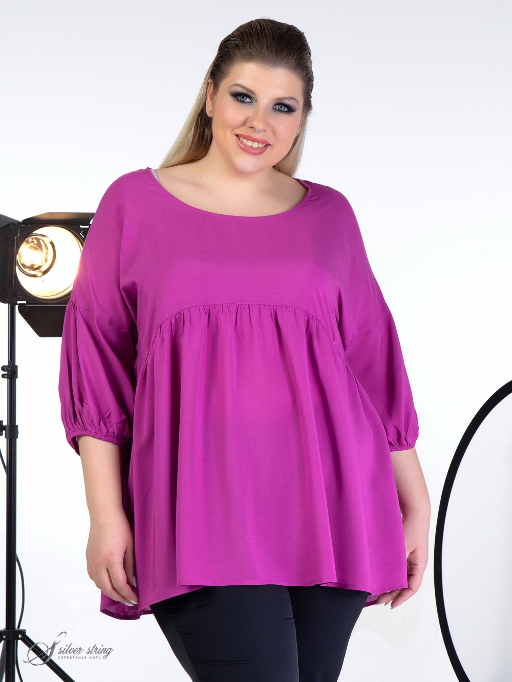 Яркая туника свободного силуэта, с удлиненной линией плеча, выполнена из легкой ткани с высоким содержанием хлопка. Сатиновое переплетение нитей в полотне, придает материалу бархатистость и приятный блеск. Модель романтического стиля. Рукав объемный, длиной за локоть. По низу рукава проложена узкая тесьма-резинка. Горловина округлой формы. На полочке и спинке расположены изогнутые подрезы. По линиям подрезов проходит легкая сборка. Изделие прекрасно маскирует проблемные места фигуры и рук, создавая ощущение комфорта и свободы.