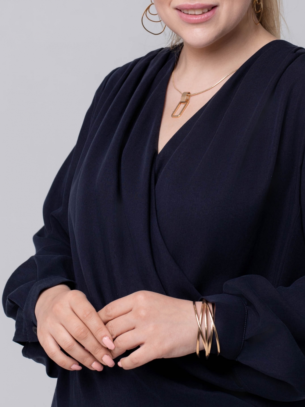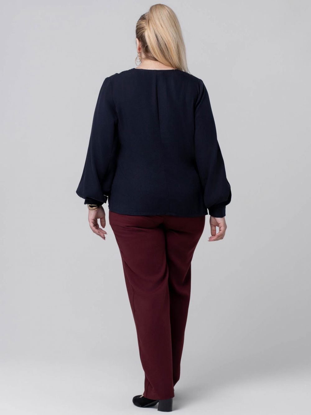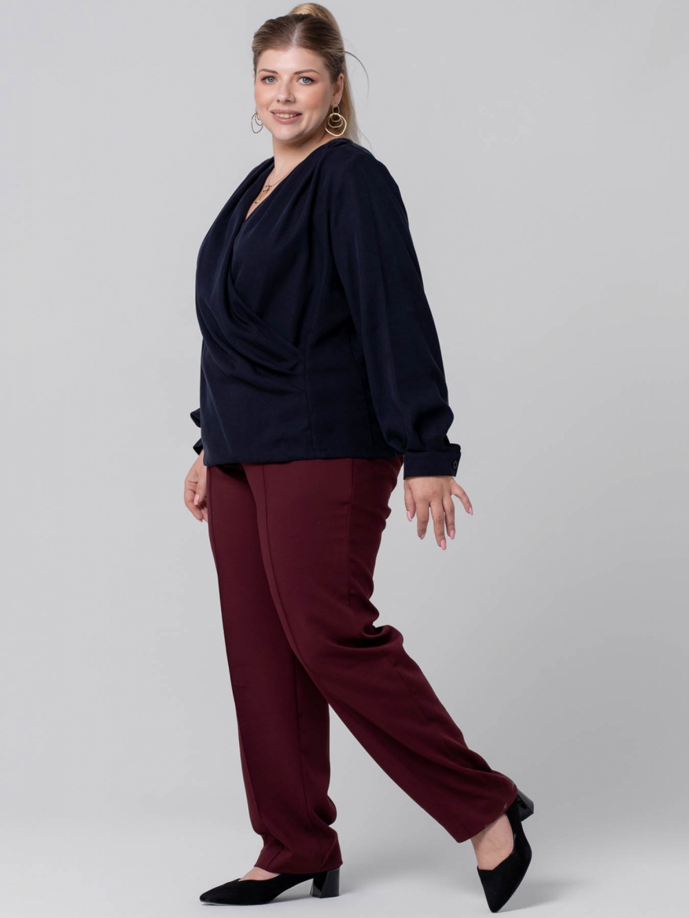 Эта элегантная блузка полуприлегающего силуэта, в стиле «Casual» выполнена из гипоаллергенной ткани Тенсель. Нежный, бархатистый материал глубокого цвета - идеальный выбор для создания расслабленного, но выразительного образа. Объемные рукава, оформленные притачной манжетой, обеспечивают удобство и комфорт. Регулировка обхвата манжеты с помощью пары пуговиц позволяет подобрать идеальную посадку по запястью. Мягкие складки, заложенные по плечам блузы, спускаются красивой драпировкой к боку, обрамляя У-образный вырез, что делает модель изысканной и женственной.