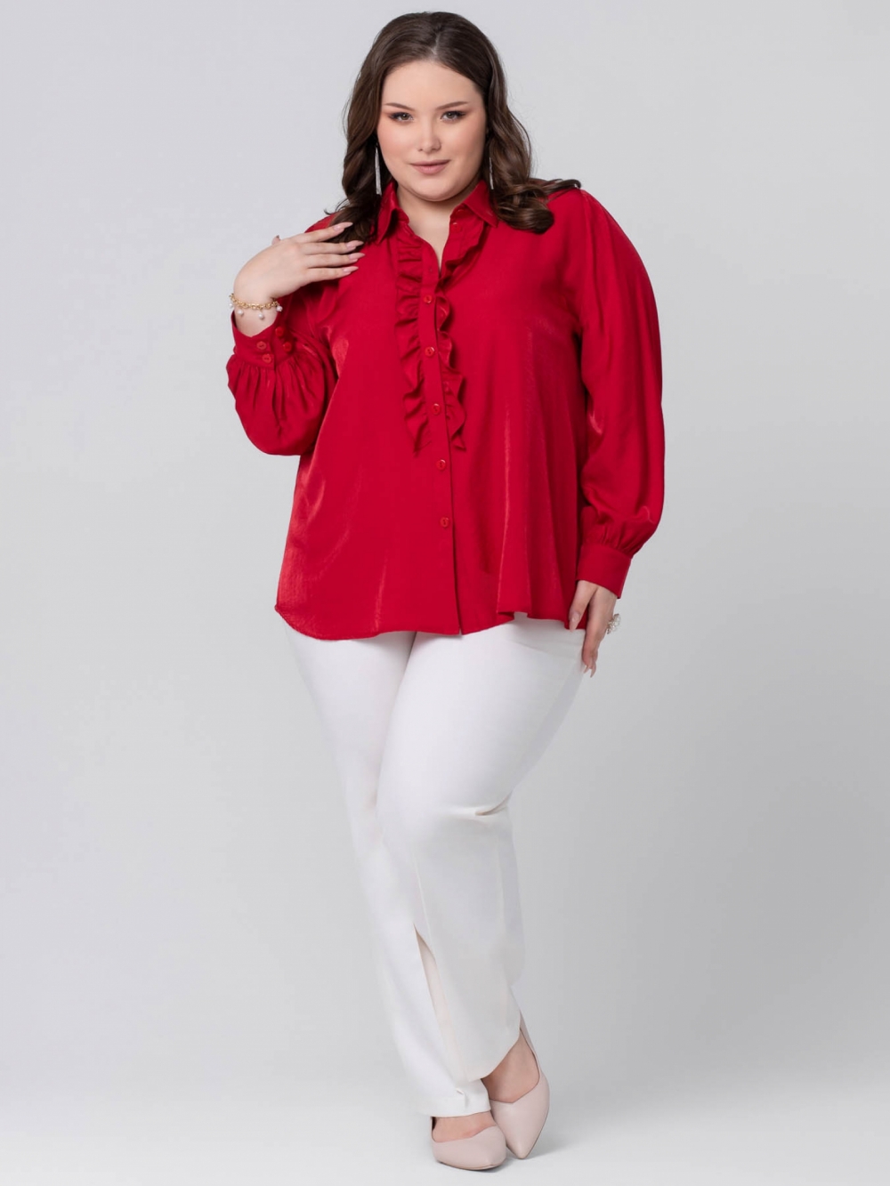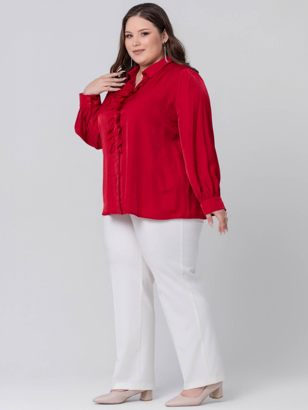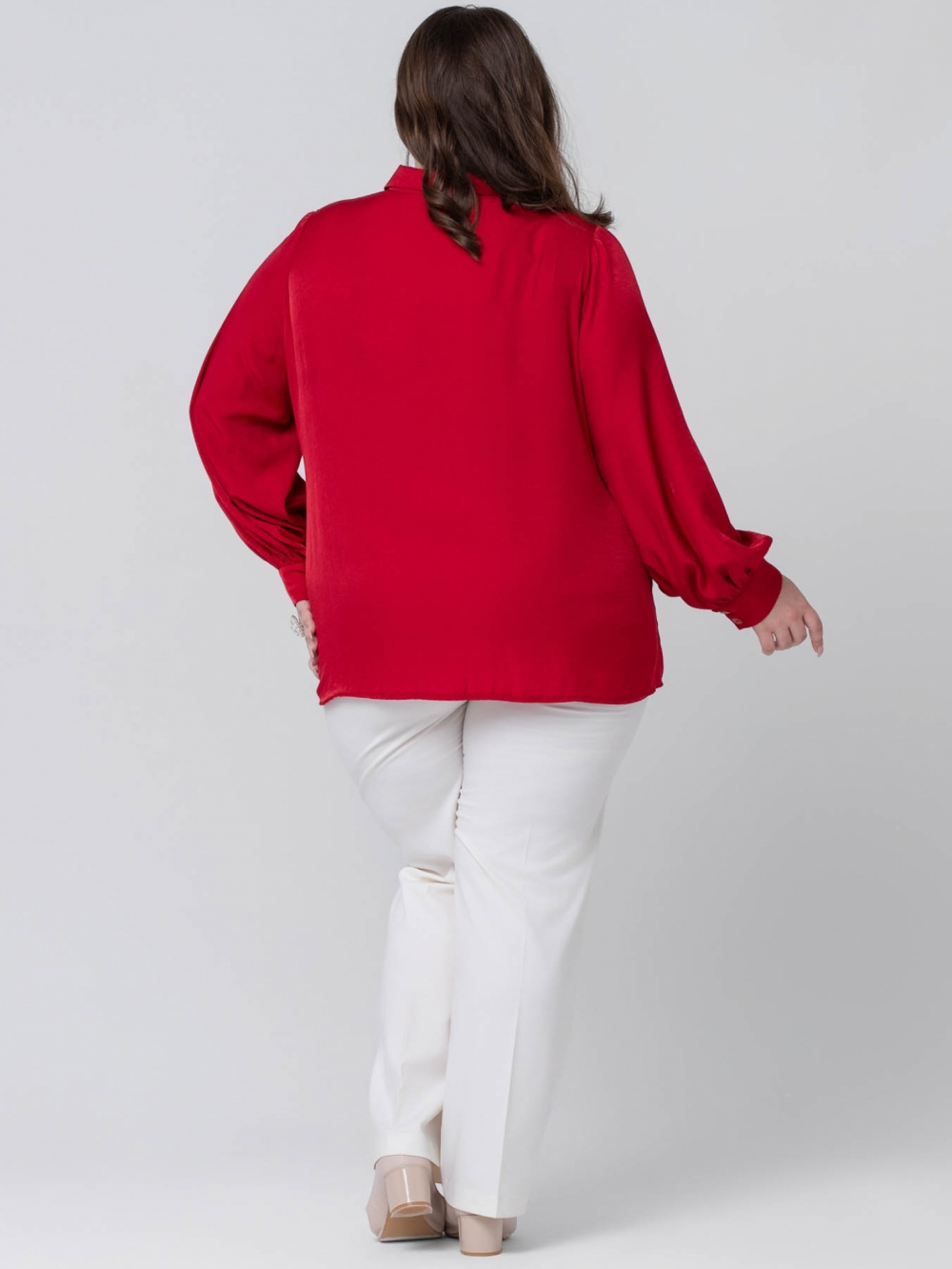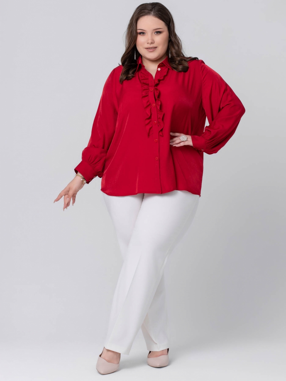 Эта эффектная блузка прямого силуэта из шелковистой ткани удивительного оттенка красного цвета, который обладает мощным энергетическим воздействием. Модель с длинным, втачным рукавом, с притачной манжетой. Объем манжеты можно регулировать за счет парных пуговиц. Воротник рубашечный, на стойке. На полочке обработана планка с застежкой на пуговицы в цвет ткани. Особый шарм изделию придает изящное жабо на груди. Блуза — идеальный выбор для создания элегантного образа, который привлекает внимание и вызывает сильные эмоции.