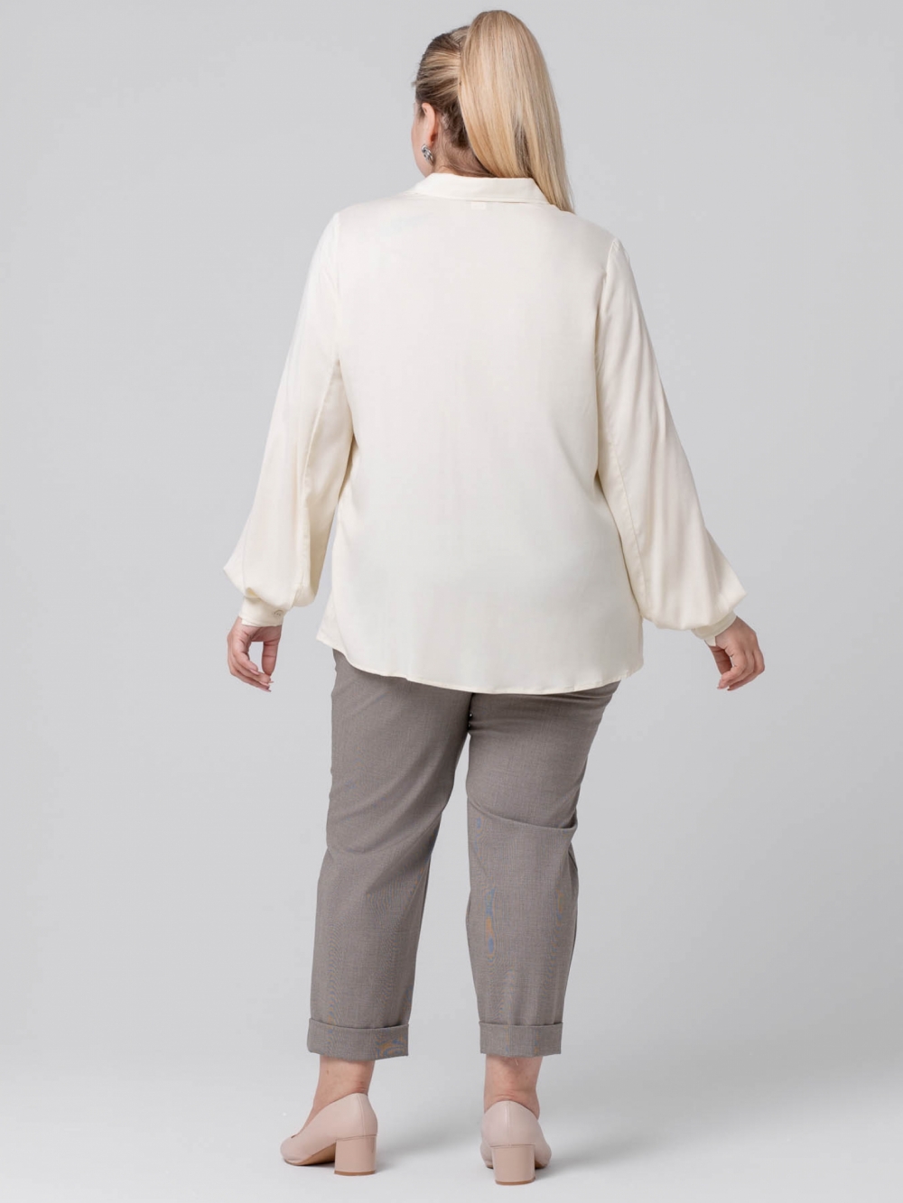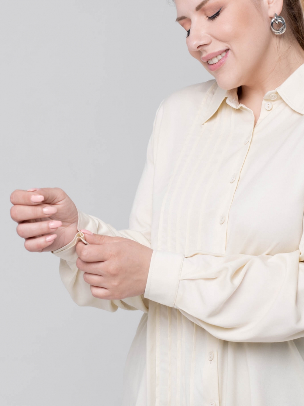 Оригинальная блузка, в стиле «Casual», прямого силуэта, выполнена из гладкокрашеной ткани с высоким содержанием натурального волокна. Модель с застежкой на пуговицы. На правой стороне полочки застрочены вертикальные защипы. Рукав втачной, длинный, с притачной манжетой. Объем манжеты можно регулировать за счет парных пуговиц. Воротник рубашечный, на стойке. Это простая по форме модель, за счет оригинального дизайна, выглядит очень модно и привлекательно.
