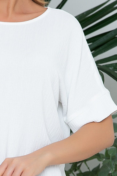 Блузка свободного силуэта из текстильного полотна с цельнокроеными рукавами.