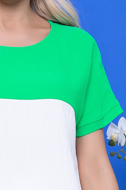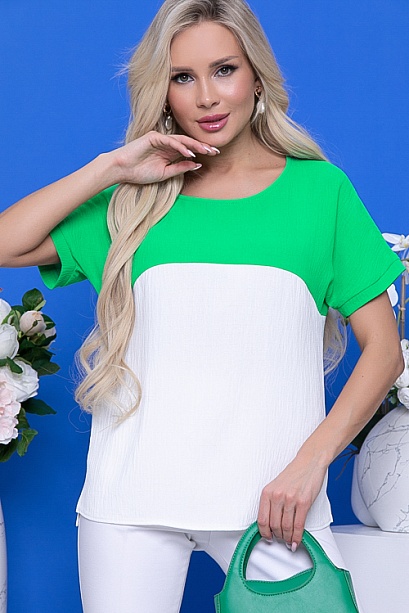 Комбинированная блузка свободного силуэта из текстильного полотна с цельнокроеными рукавами.