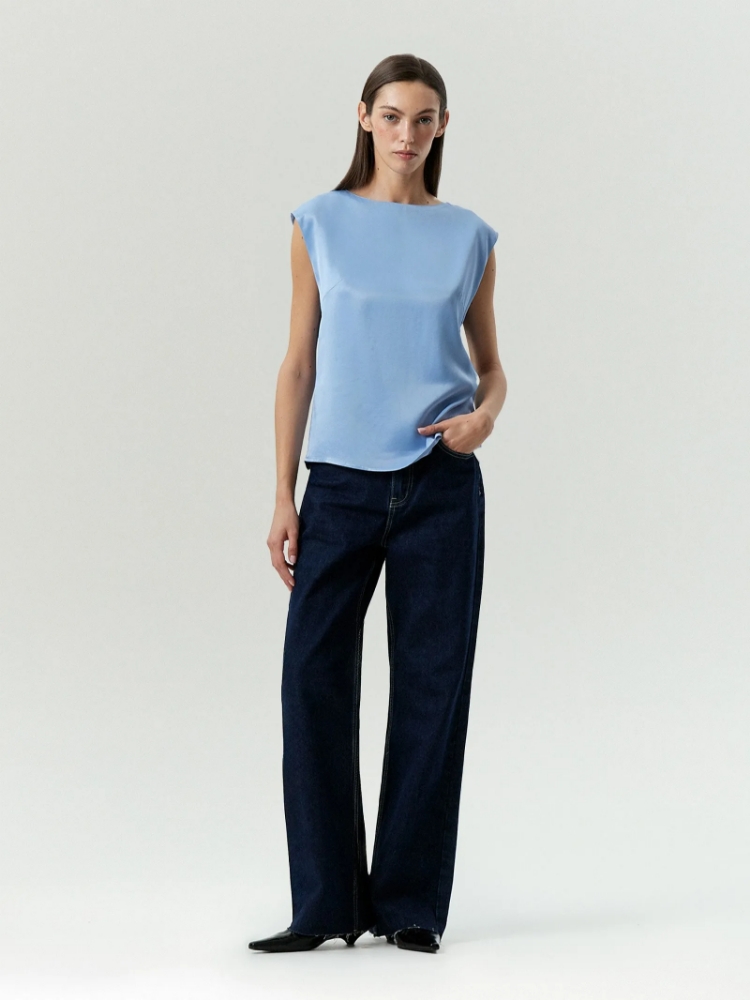 Базовая блуза в модном оттенке голубого радует глаз. Сделана из приятного к телу, мягкого и шелковистого вискозного сатина. Топ без рукавов со спущенным плечом слегка прикрывает верхнюю часть руки и закрывает грудь, горловина подходит к ярёмной впадине. Удлинённая модель прямого кроя удобна для образов с жакетами, сочетается с базовым и с нарядным низом. Отлично садится на любую фигуру. Изделие выполнено на подкладке из вискозы