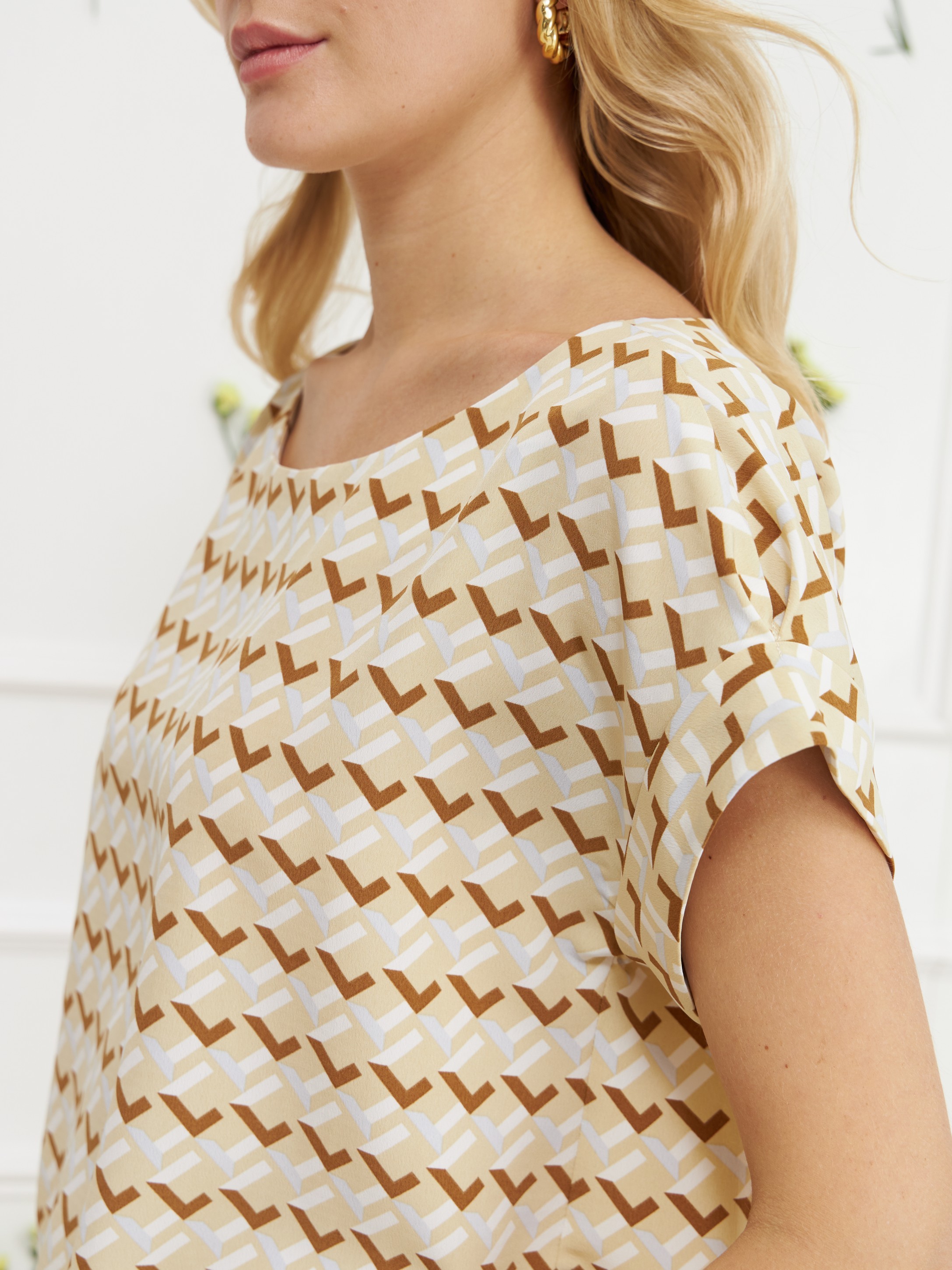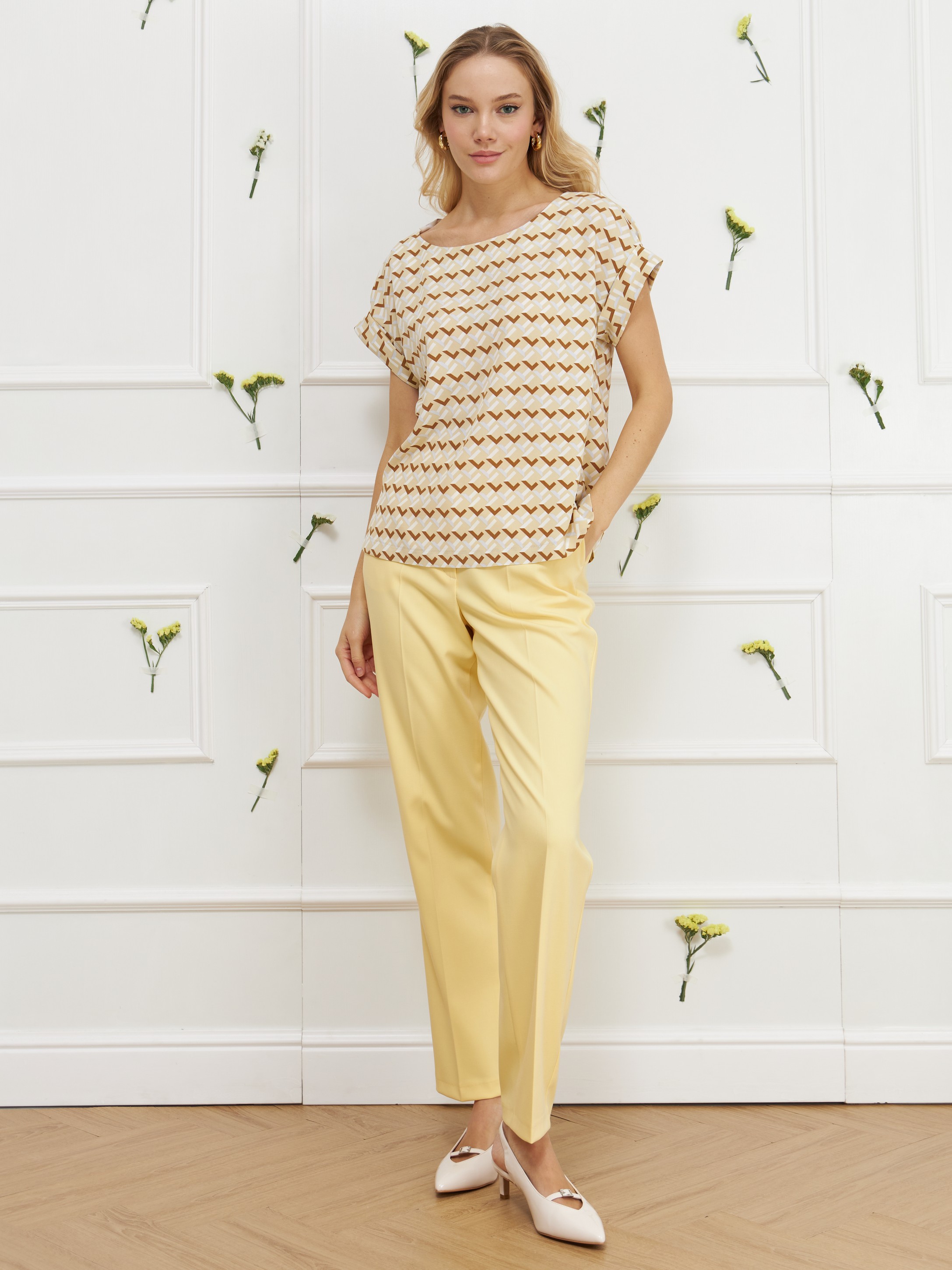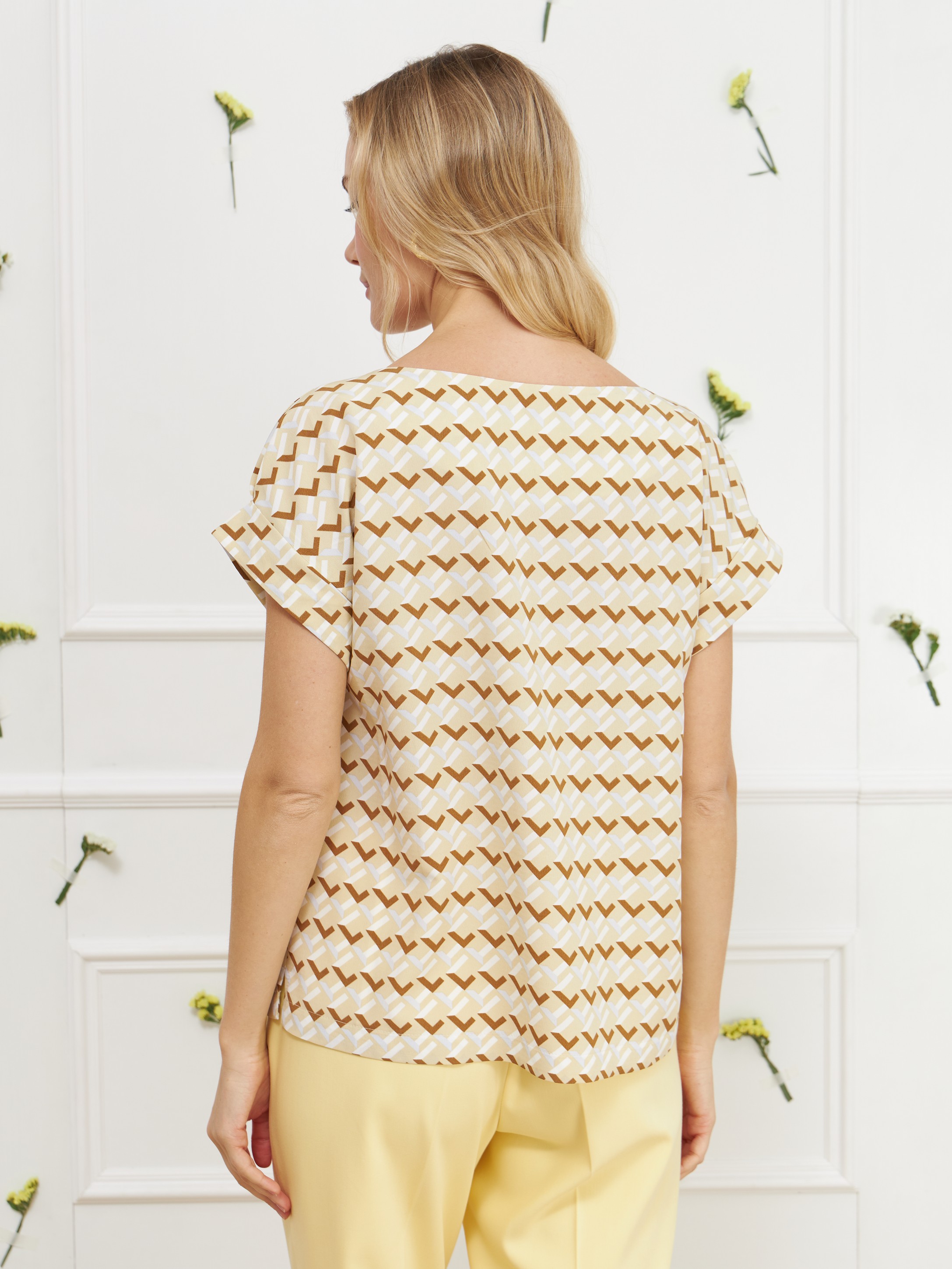 Блуза с мелким графичным орнаментом, в солнечных оттенках, имеет прямой крой и короткие цельнокроеные рукава с широкими отворотами. Дышащий материал практически не мнется и приятный к телу.