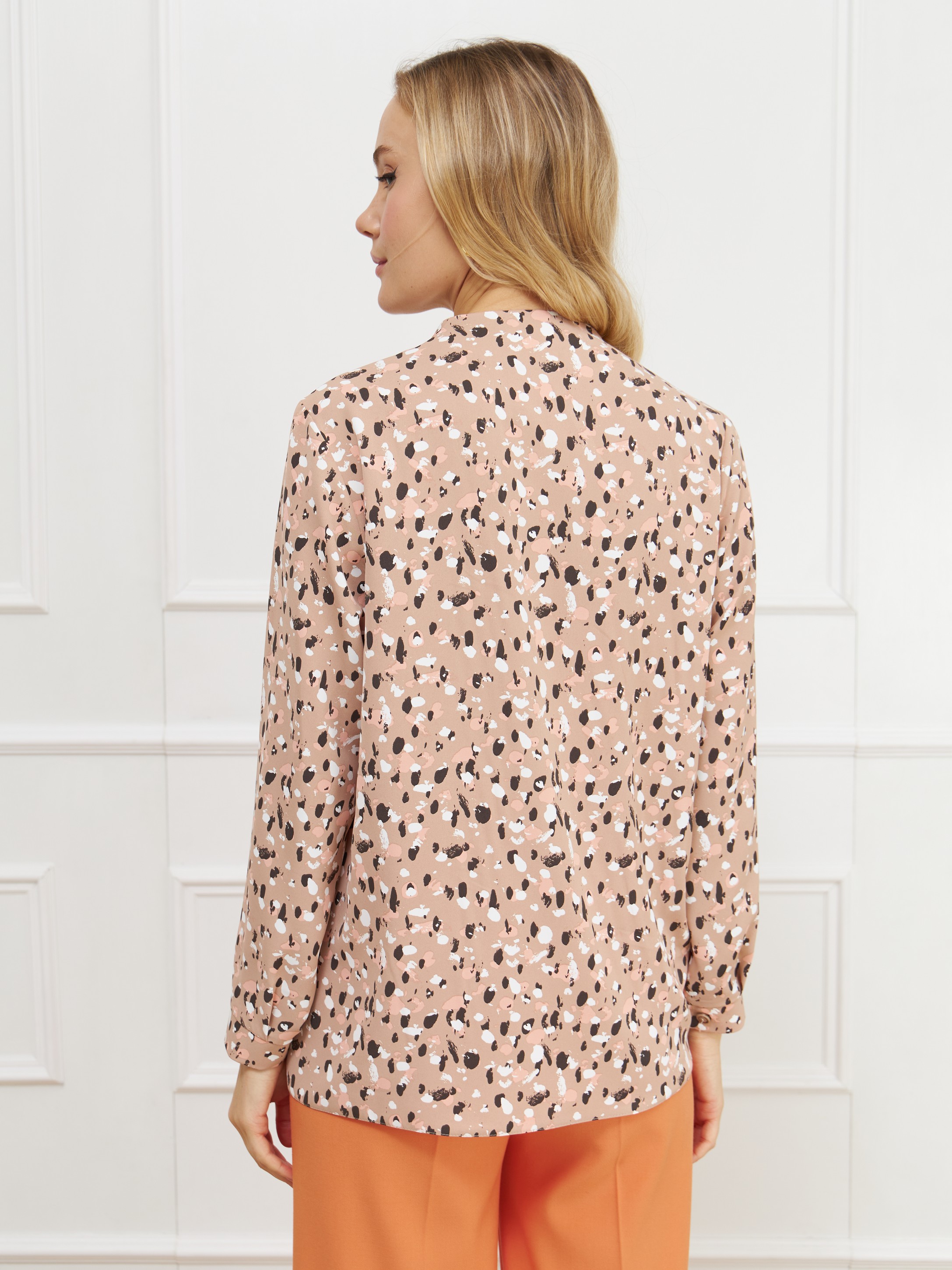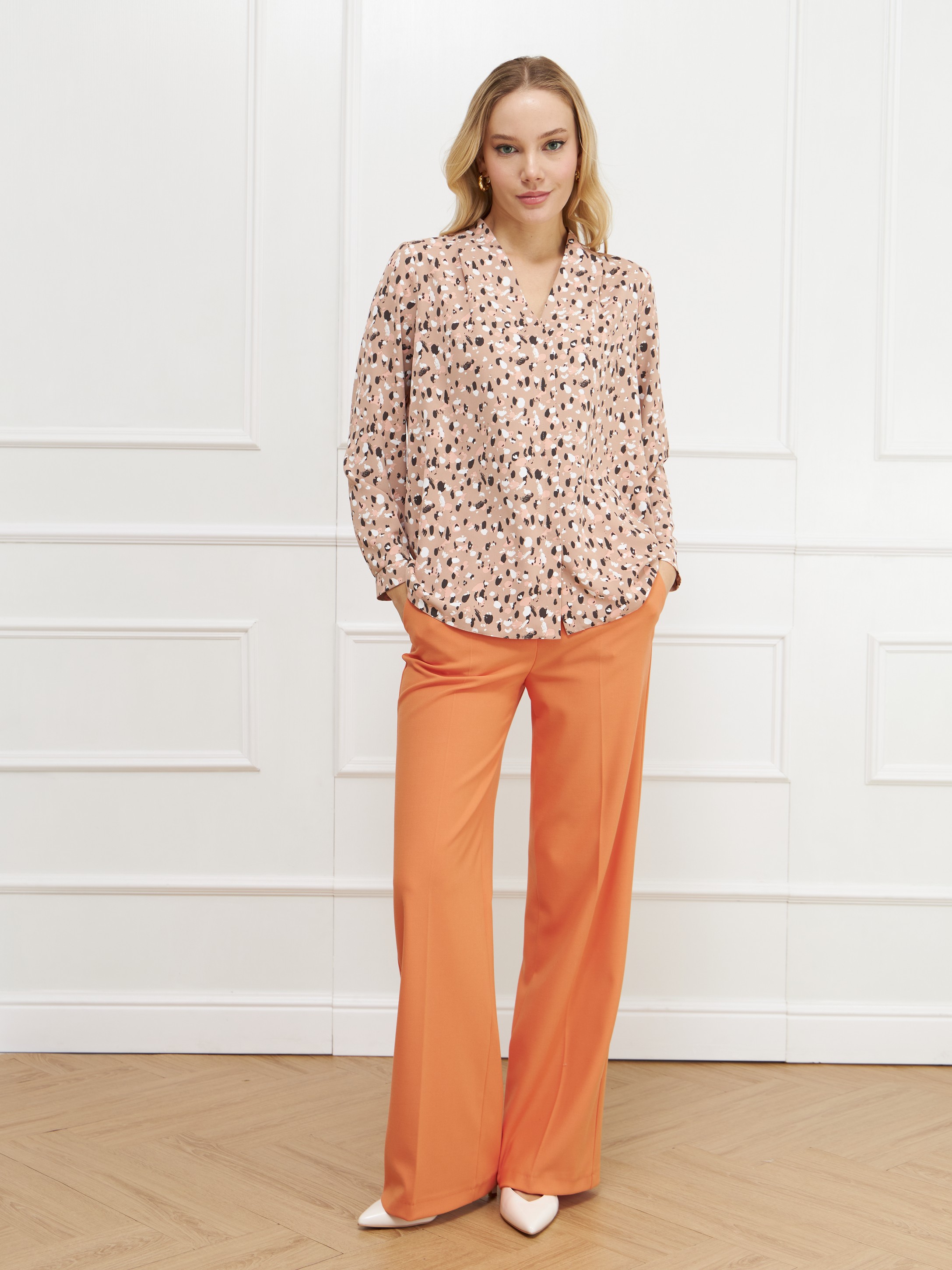 Блуза с мелким растительным паттерном имеет прямой крой, V-образную горловину, имитацию скрытой застежки спереди и длинные рукава на манжетах. Модель выполнена из дышащей ткани, приятной к телу. На фото в паре Брюки Б-2021 ОДС(В5).