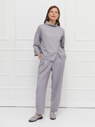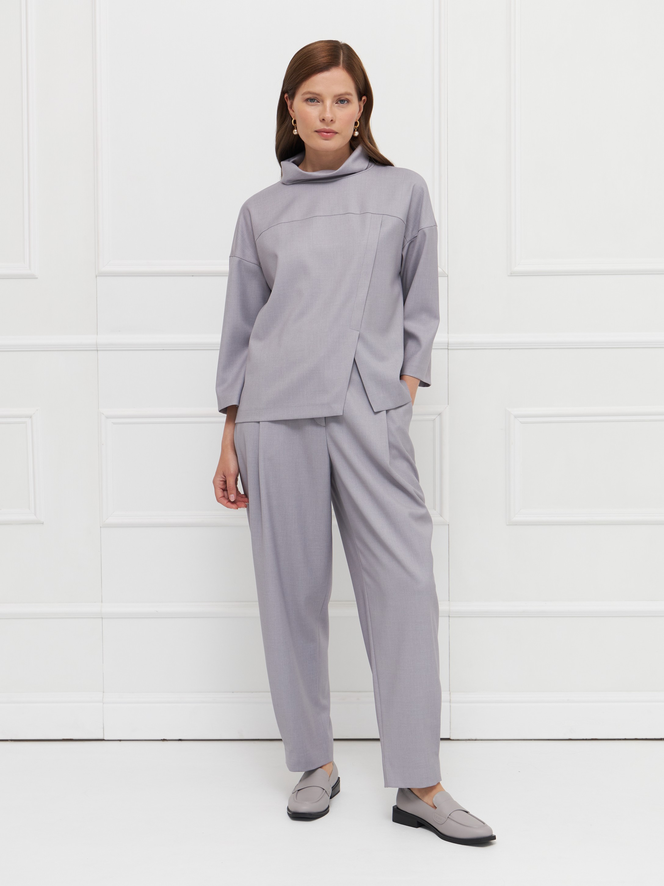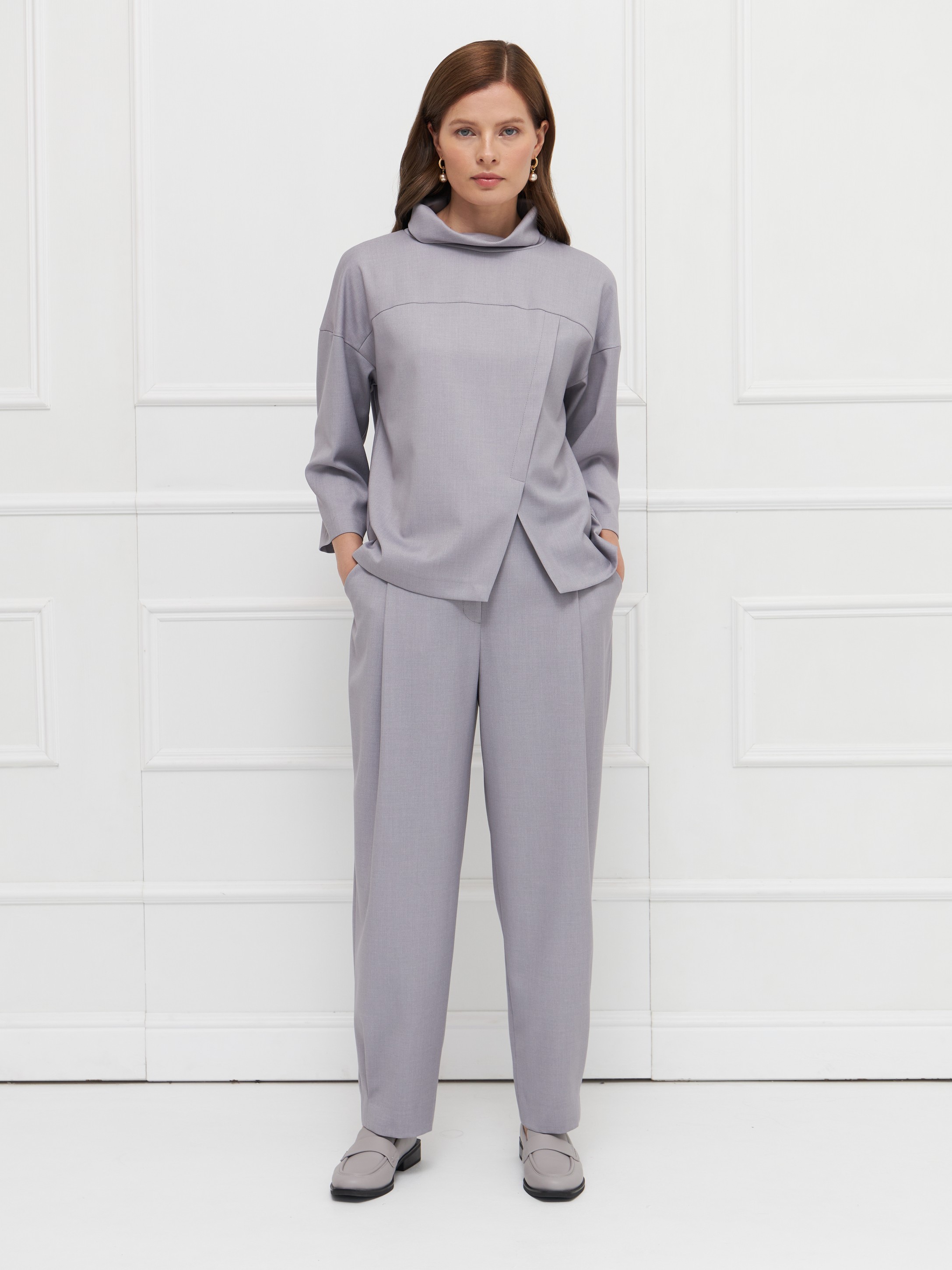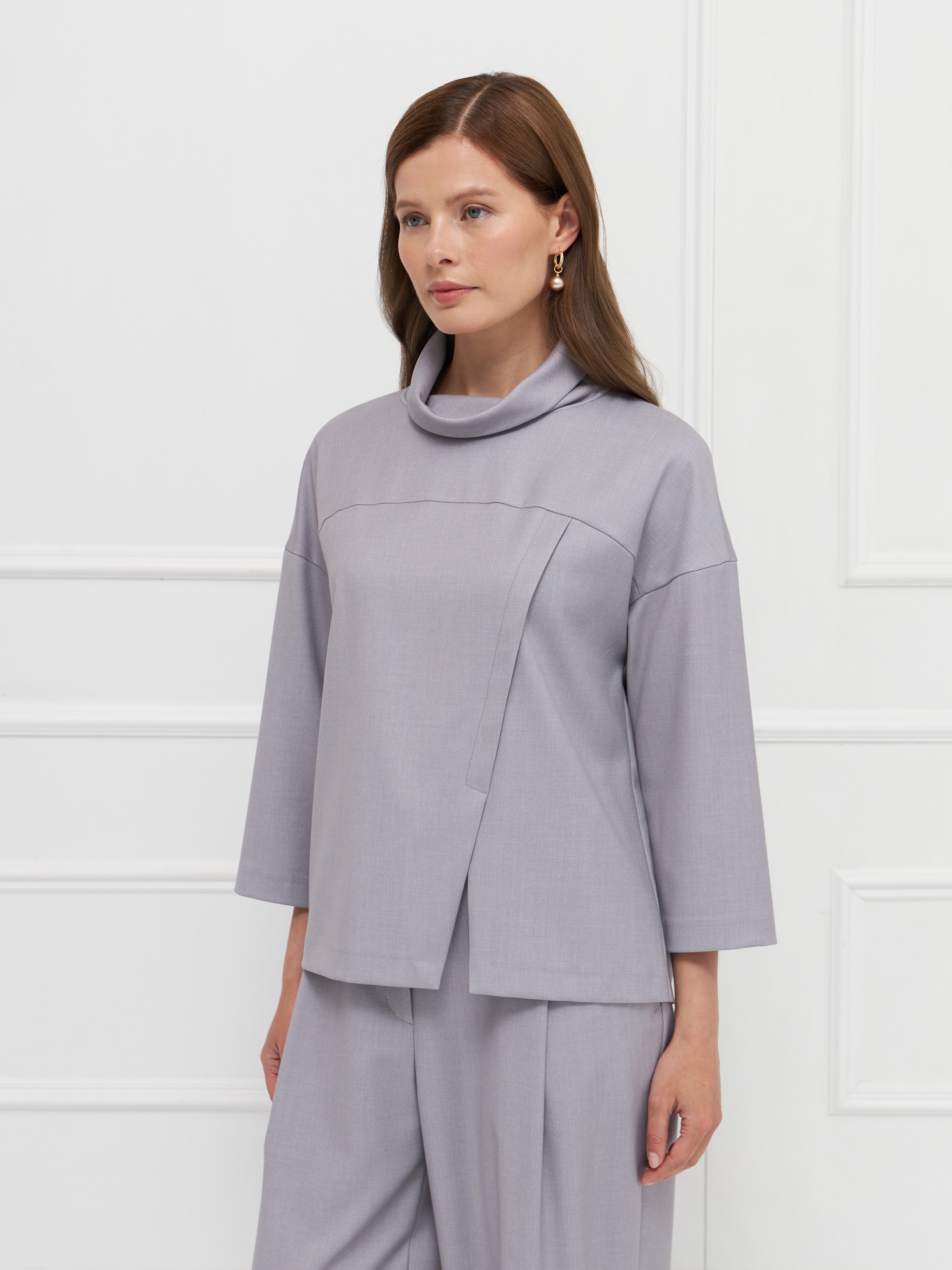 Блузка выполнена из мягкой костюмной ткани на вискозной основе — материал приятен к телу и хорошо держит форму. Прямой крой и светло-серый оттенок подчеркивают лаконичность модели. Воротник-хомут придает образу мягкость и делает акцент в верхней части силуэта. Спущенная линия плеча создает расслабленный силуэт, а рукава длиной 7/8 уравновешивают пропорции. Имитация супатной асимметричной застежки добавляет модели визуальной динамики без утраты строгости. Блузка легко вписывается в деловой гардероб, сохраняя баланс между классикой и современностью. На фото в паре Брюки Б-2044 ПЛТ(О5).