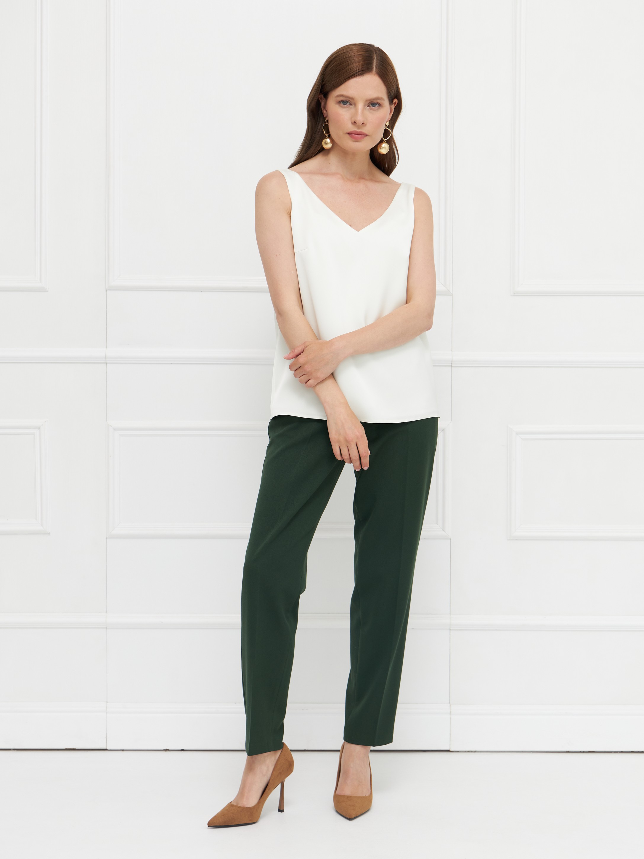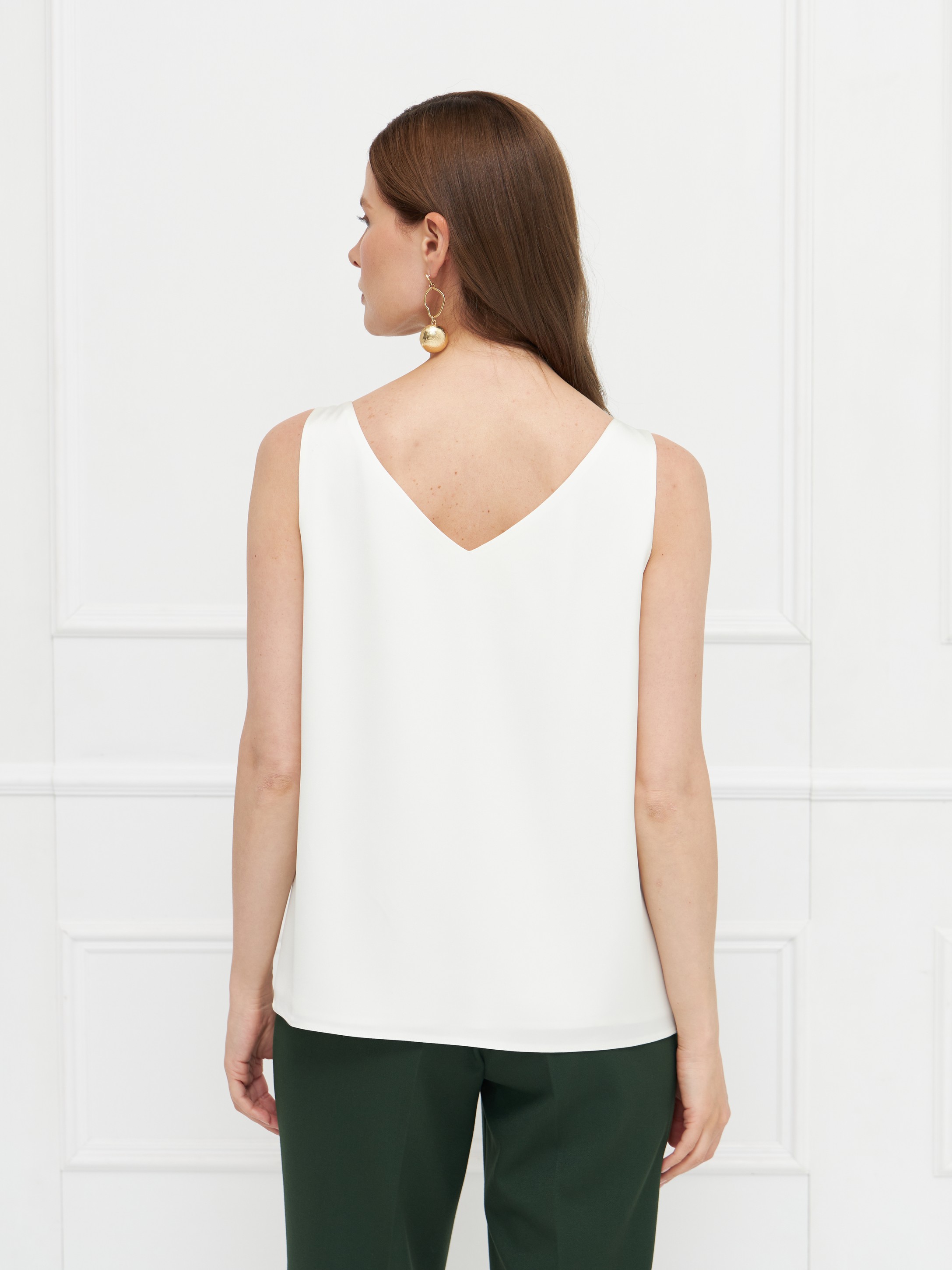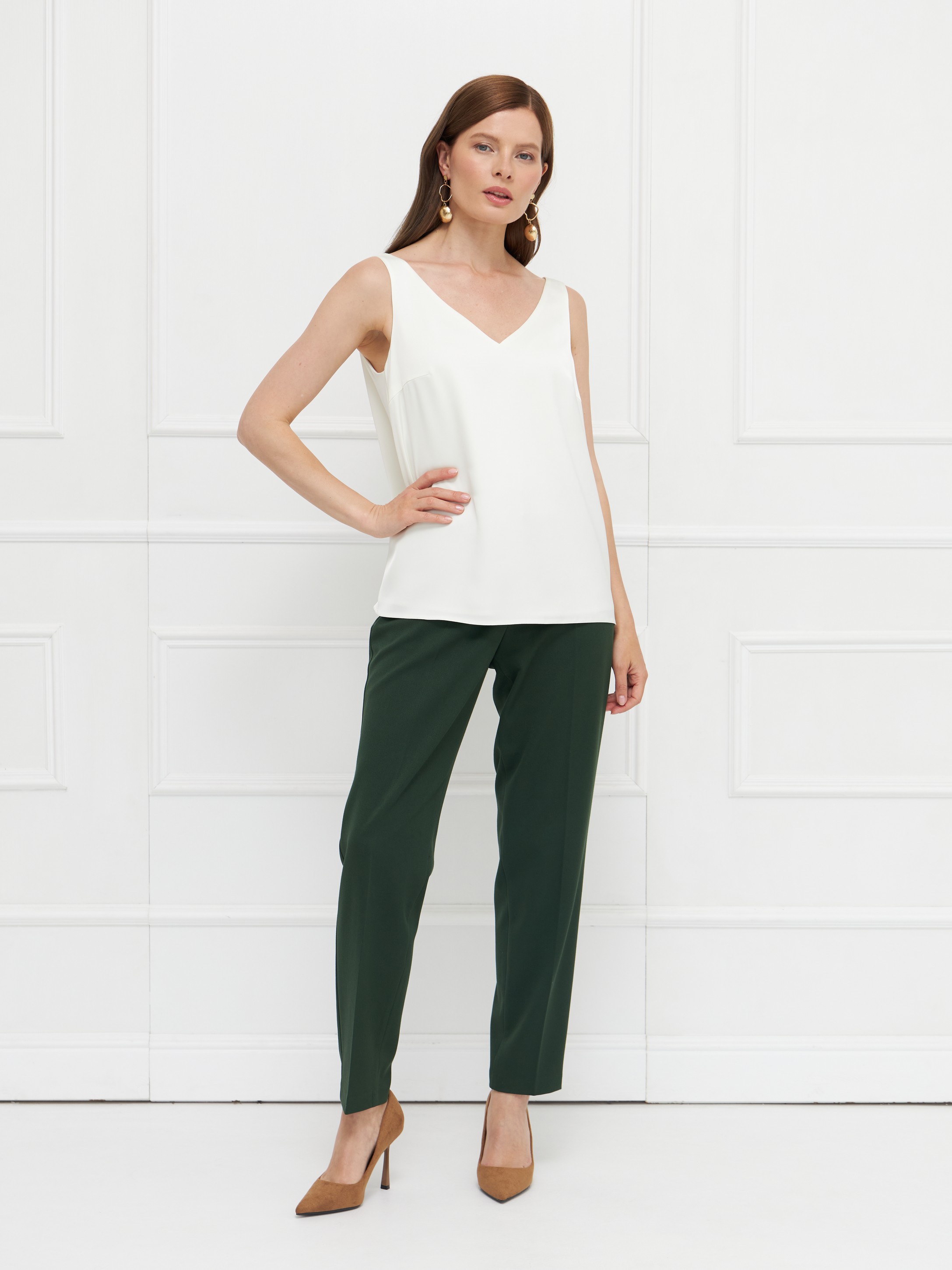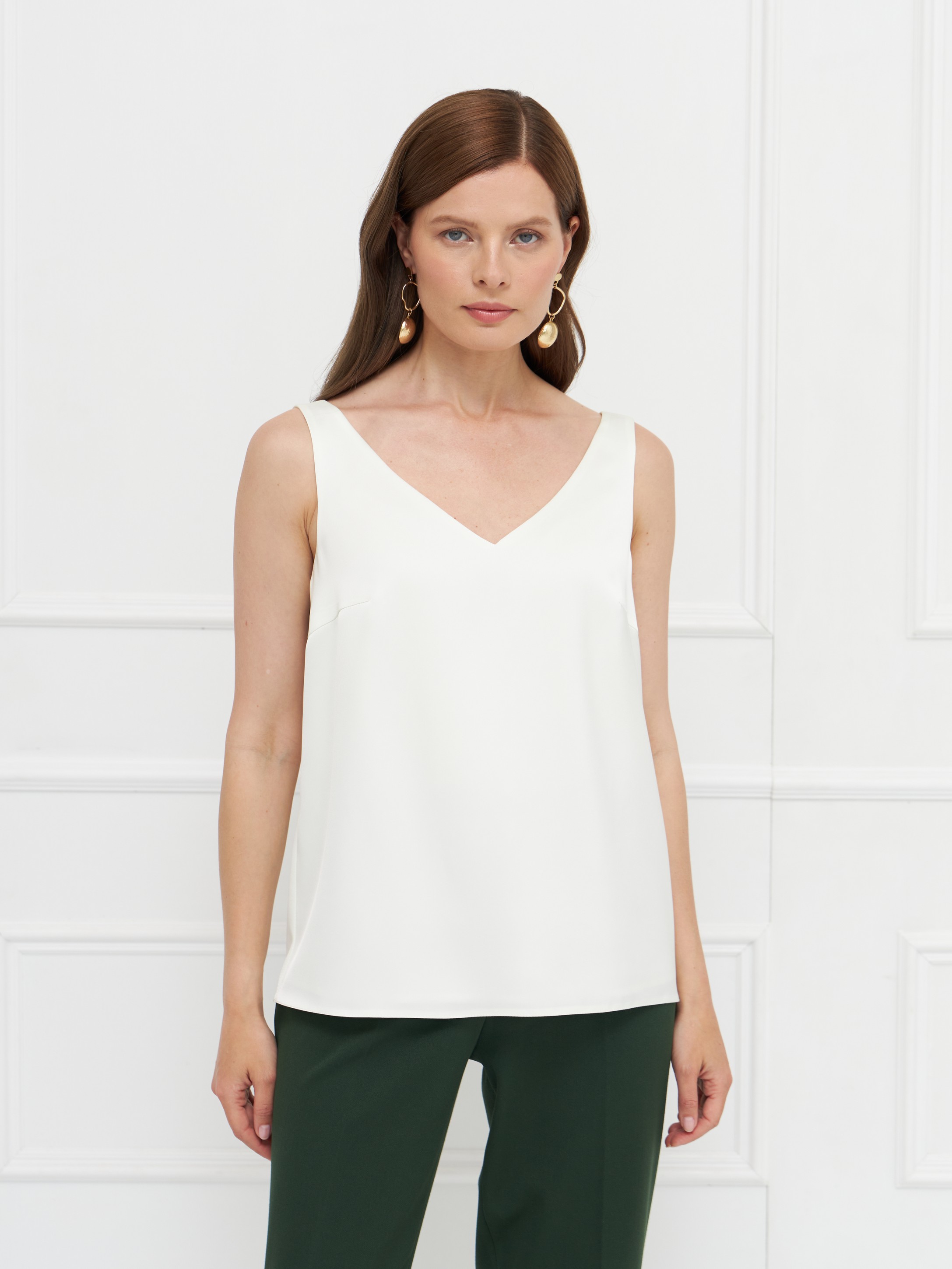 Белый топ без рукавов выполнен из тонкой блузочной ткани и дополнен мягкой эластичной подкладкой, обеспечивающей комфорт и безупречную посадку. Широкие бретели устойчиво держат форму и добавляют модели лаконичности. У-образный вырез подчеркивает линию шеи и придаёт образу элегантность. Лёгкая и универсальная вещь, которая отлично сочетается с жакетами, вписываясь как в деловой, так и в повседневный гардероб. На фото в паре Брюки Б-704 ЗМО(О5).