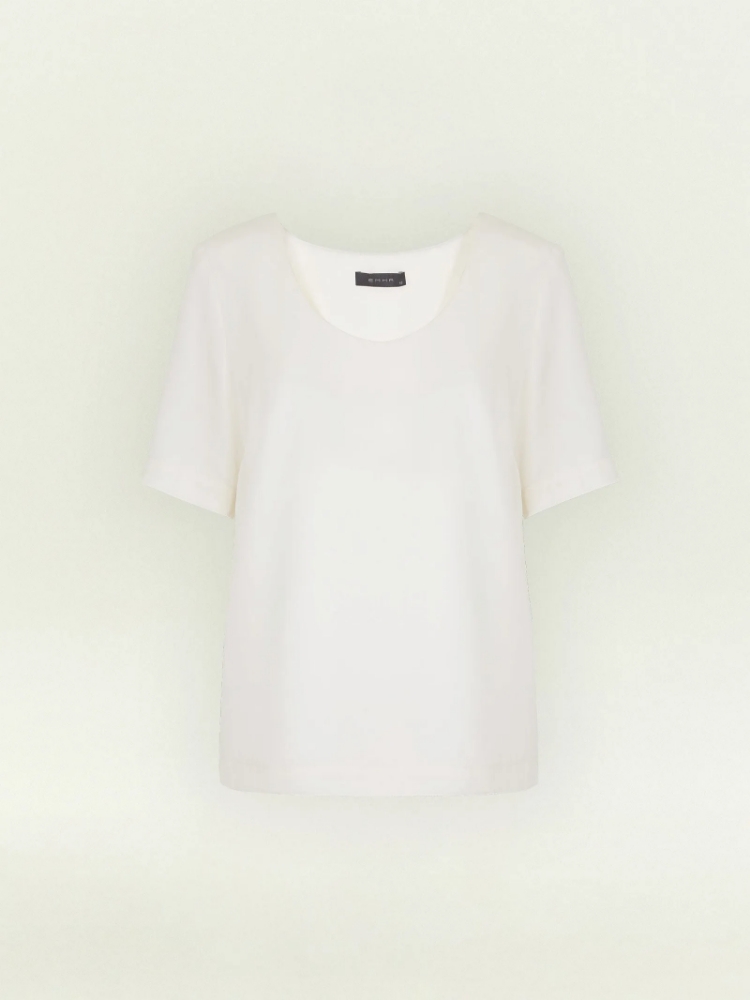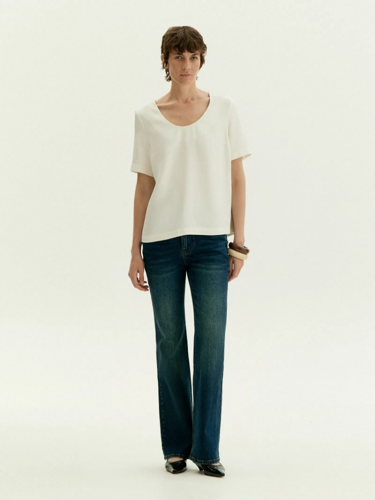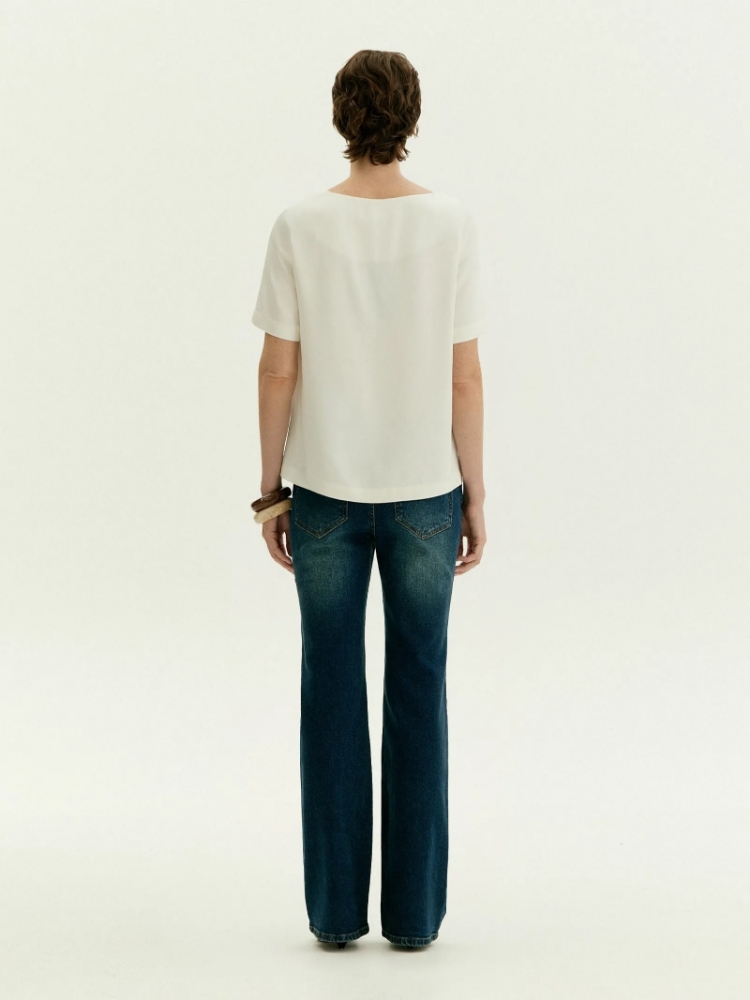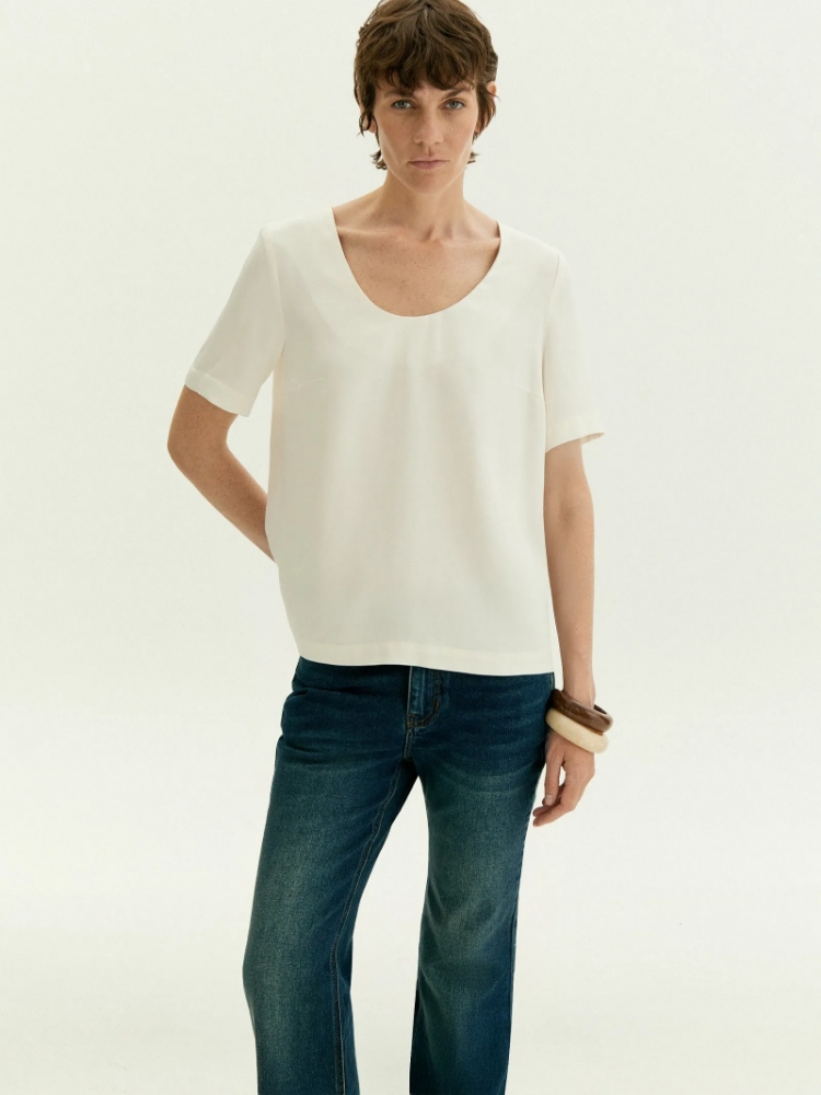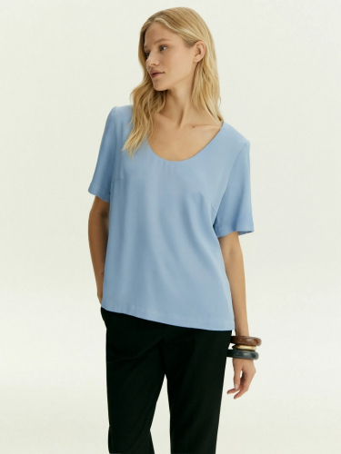 Лаконичная блуза с коротким рукавом и расширенным U-вырезом поддержит минималистичное настроение. Красиво открывает ключицы и руки. Имеет аккуратные вытачки в области груди. Выполнена из приятной к телу вискозы, без подкладки. Сочетается с любым базовым низом, а также модными золотыми браслетами и крупными серьгами