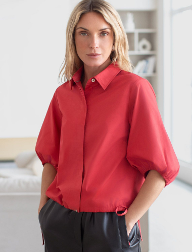 Укороченная блузка с пышными рукавами-фонариками выполнена из легкого хлопкового поплина. Супатная застежка на пуговицы из натурального перламутра. Внизу кулиса с лентами из основного полотна. В изделии будет комфортно, даже в самое жаркое время года. Подходит для любой фигуры. Сочетается в костюме с кюлотами D24.233 и юбкой D26.179