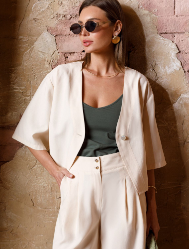 Рост 172, бюст 88, талия 64, бедра 88 Блузка свободного кроя в стиле кимоно выполнена из плотного лиоцелла. Модель со спущенным плечом и застежкой на одну пуговицу. Ткань изделия отлично держит форму, плавно драпируется и не просвечивает. В теплое время года приятно охлаждает кожу. Добавление синтетических волокон в составе изделия, предотвращает сминаемостьи поддерживает формоустойчивость. Блузка сочетается в костюме с брюками D24.261, D24.265, D24.267, шортами D28.057 и юбкой D24.261, а также очень эффектно с белыми шортами и джинсами.