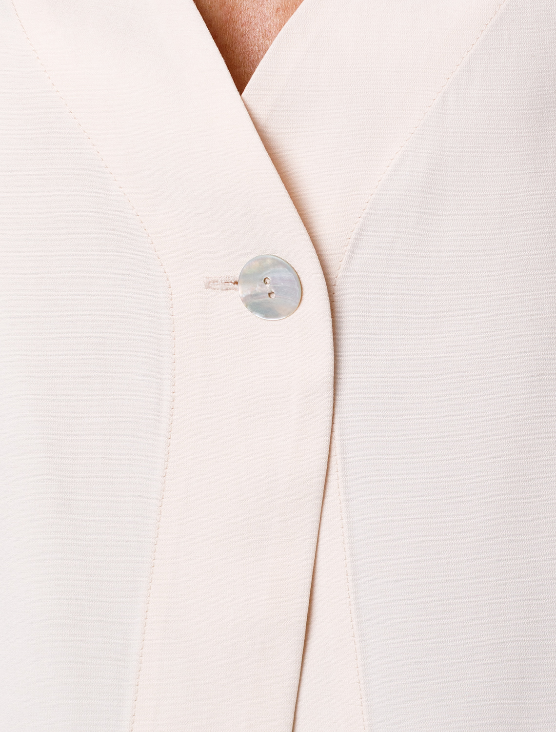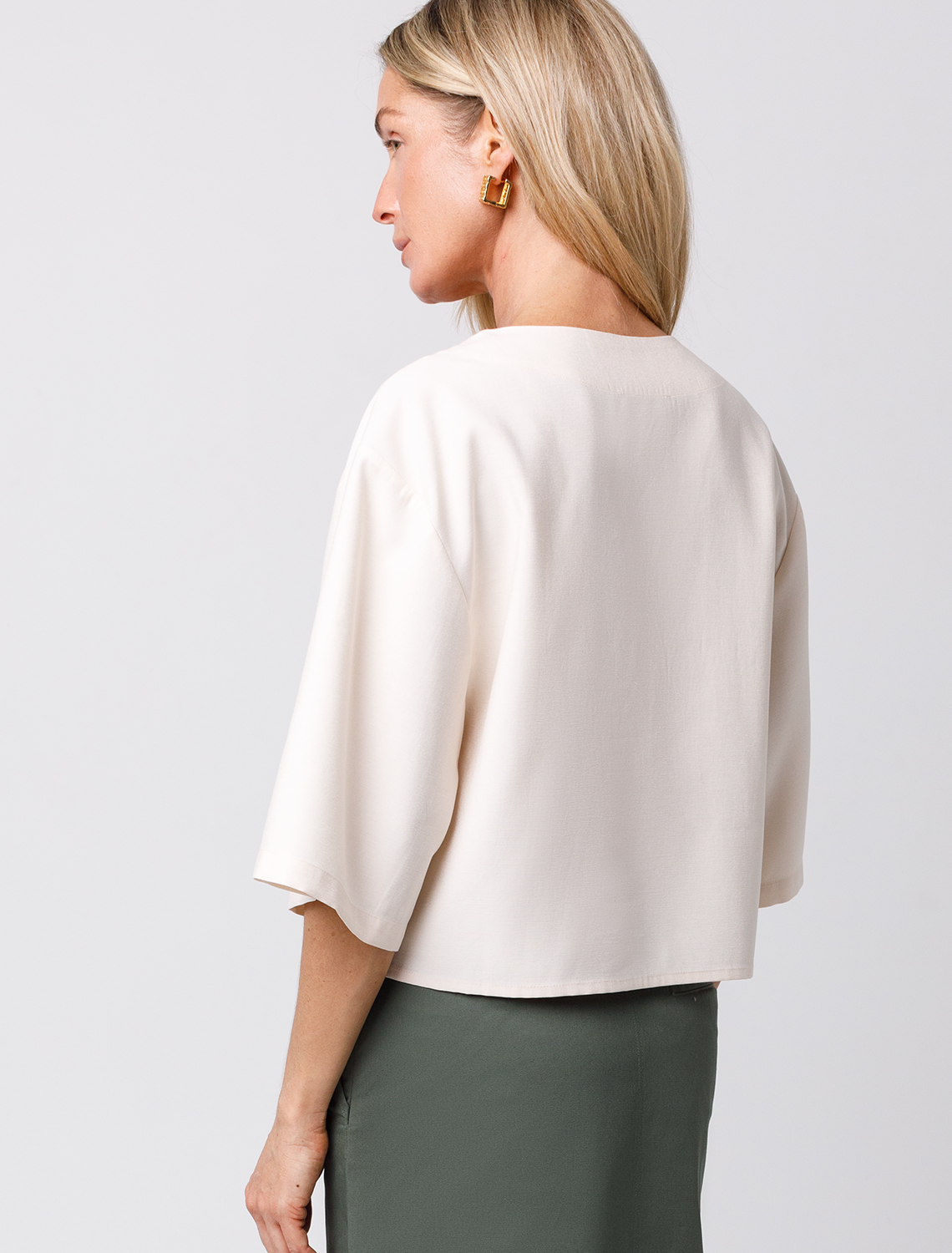 Блузка свободного кроя в стиле кимоно выполнена из плотного лиоцелла. Модель со спущенным плечом и застежкой на одну пуговицу. Ткань изделия отлично держит форму, плавно драпируется и не просвечивает. В теплое время года приятно охлаждает кожу. Добавление синтетических волокон в составе изделия, предотвращает сминаемостьи поддерживает формоустойчивость. Блузка сочетается в костюме с брюками D24.261, D24.265, D24.267, шортами D28.057 и юбкой D24.261, а также очень эффектно с белыми шортами и джинсами. кокосово-молочный