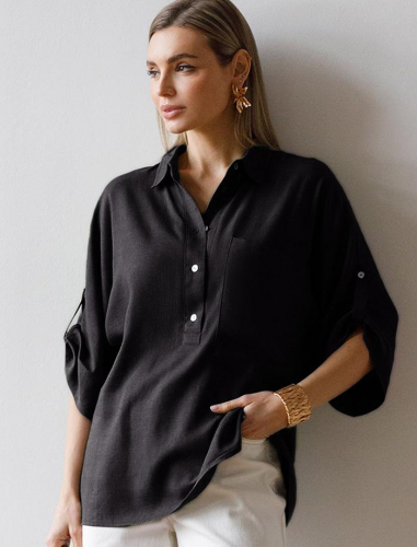 Блузка свободного кроя в стиле кимоно выполнена из плотного лиоцелла. Модель со спущенным плечом и застежкой на одну пуговицу. Ткань изделия отлично держит форму, плавно драпируется и не просвечивает. В теплое время года приятно охлаждает кожу. Добавление синтетических волокон в составе изделия, предотвращает сминаемостьи поддерживает формоустойчивость. Блузка сочетается в костюме с брюками D24.261, D24.265, D24.267, шортами D28.057 и юбкой D24.261, а также очень эффектно с белыми шортами и джинсами. терракотовый