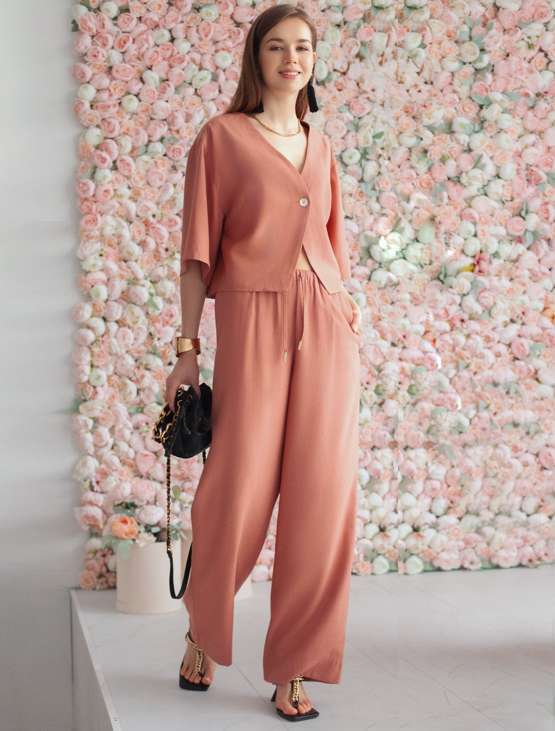 Блузка свободного кроя в стиле кимоно выполнена из плотного лиоцелла. Модель со спущенным плечом и застежкой на одну пуговицу. Ткань изделия отлично держит форму, плавно драпируется и не просвечивает. В теплое время года приятно охлаждает кожу. Добавление синтетических волокон в составе изделия, предотвращает сминаемостьи поддерживает формоустойчивость. Блузка сочетается в костюме с брюками D24.261, D24.265, D24.267, шортами D28.057 и юбкой D24.261, а также очень эффектно с белыми шортами и джинсами.