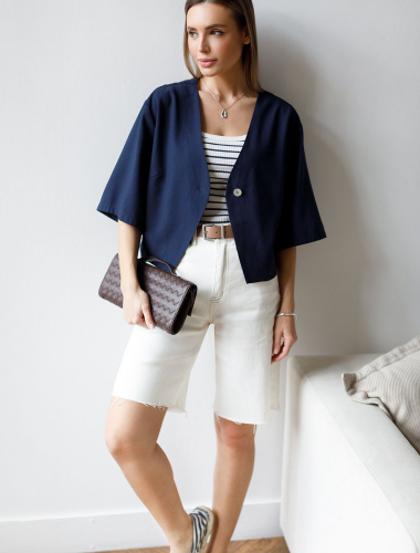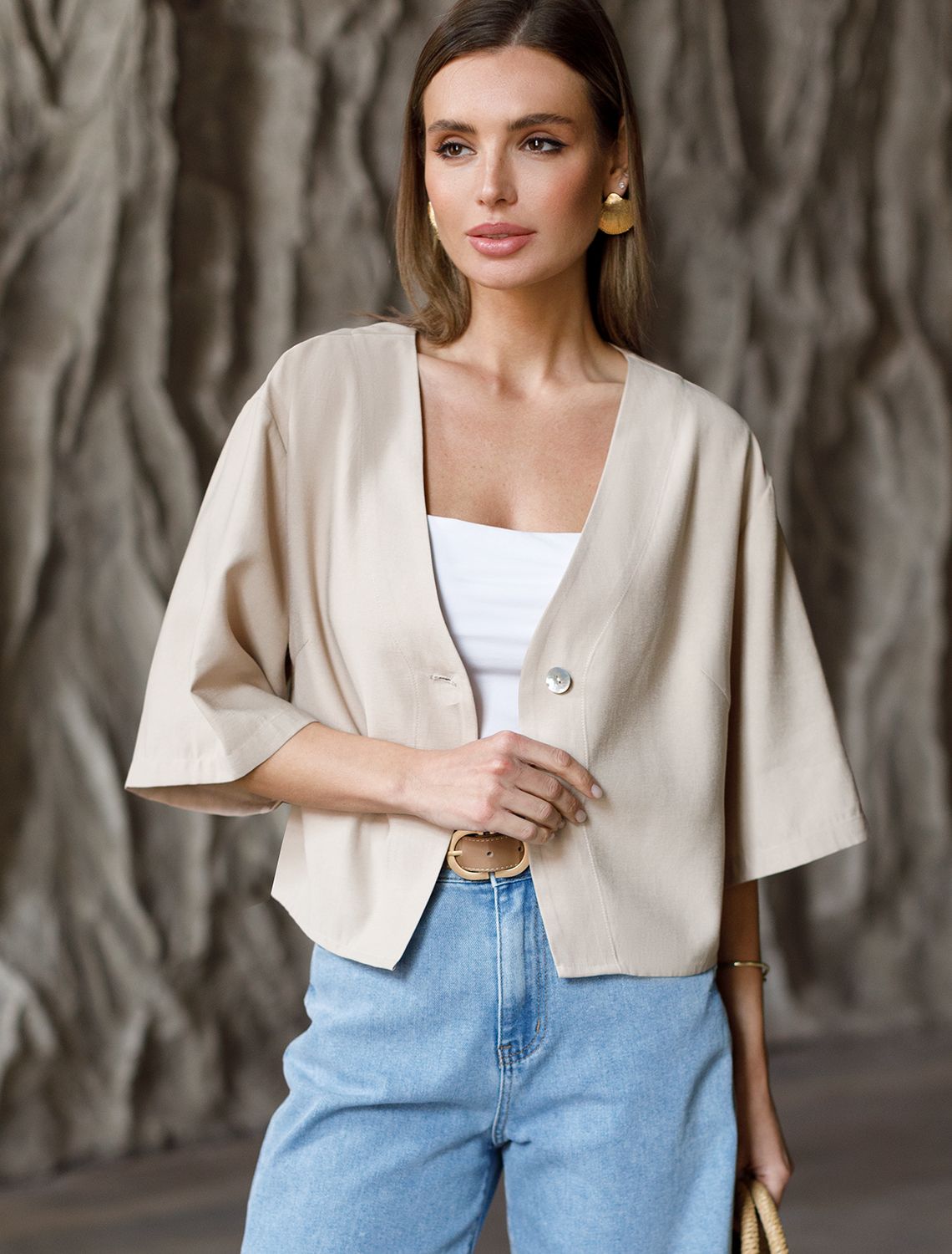 Блузка свободного кроя в стиле кимоно выполнена из плотного лиоцелла. Модель со спущенным плечом и застежкой на одну пуговицу. Ткань изделия отлично держит форму, плавно драпируется и не просвечивает. В теплое время года приятно охлаждает кожу. Добавление синтетических волокон в составе изделия, предотвращает сминаемостьи поддерживает формоустойчивость. Блузка сочетается в костюме с брюками D24.261, D24.265, D24.267, шортами D28.057 и юбкой D24.261, а также очень эффектно с белыми шортами и джинсами.
