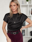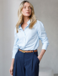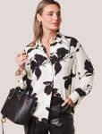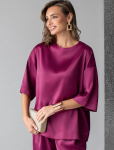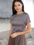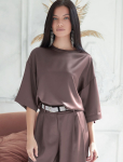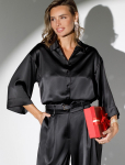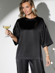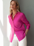 Блузка с удлиненными манжетами выполнена из тончайших нитей плотного сатина, плетение которых создает полуматовый блеск, напоминающий натуральный шёлк. На спинке изделия фирменный логотип бренда. Застежка на золотистые пуговицы. Совет стилиста: сочетайте блузку в костюме с брюками D24.534 и юбкой D26.461 чтобы создать роскошный праздничный образ, с классическими брюками или блестящим денимом.