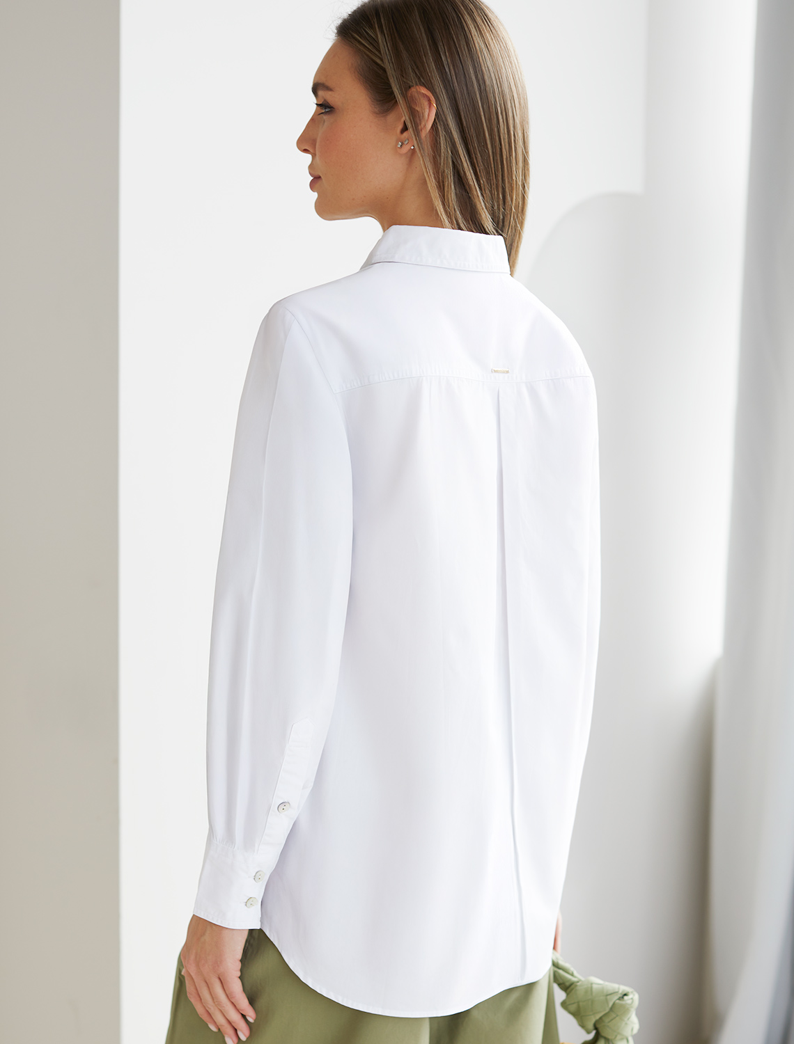 Блузка выполнена из премиального хлопкового поплина. Лаконичная модель с высокими манжетами и пуговицами из натурального перламутра хорошо впишется в любой гардероб и внесет яркий летний акцент в образ. Натуральный состав ткани обладает высокой воздухопроницаемостью и гигроскопичностью. В изделии будет комфортно, даже в самое жаркое время года. Подходит для любой фигуры. На спинке фирменный логотип бренда. натуральный белый