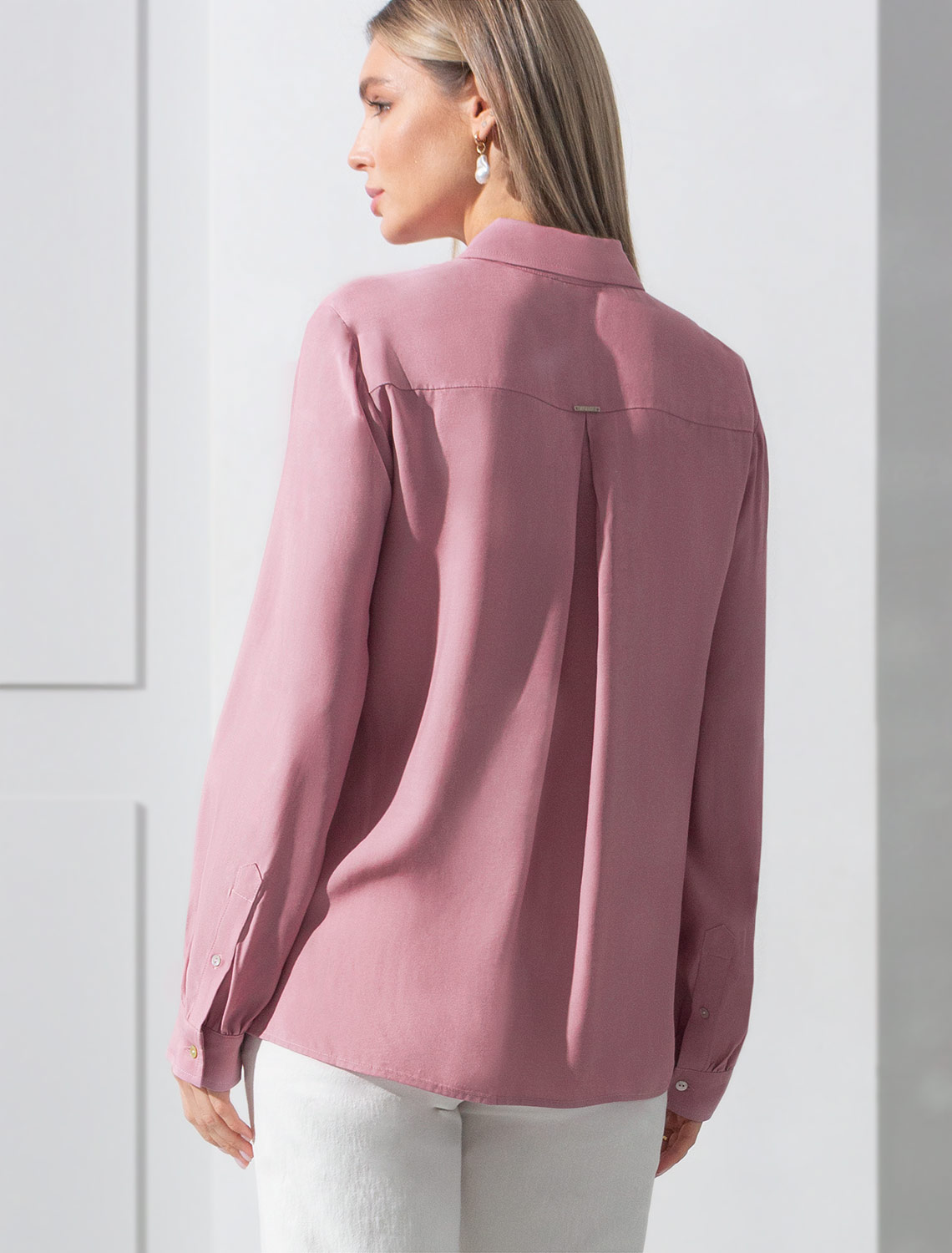 Блузка выполнена из премиальной вискозы и лиоцелла. На спинке изделия фирменный логотип бренда. Застежка на пуговицы из натурального перламутра. Приятная на ощупь ткань охлаждает кожу в жаркую погоду. Отлично впишется в нестрогий офисный дресс-код или в расслабленном повседневном образе с джинсами. пепел розы