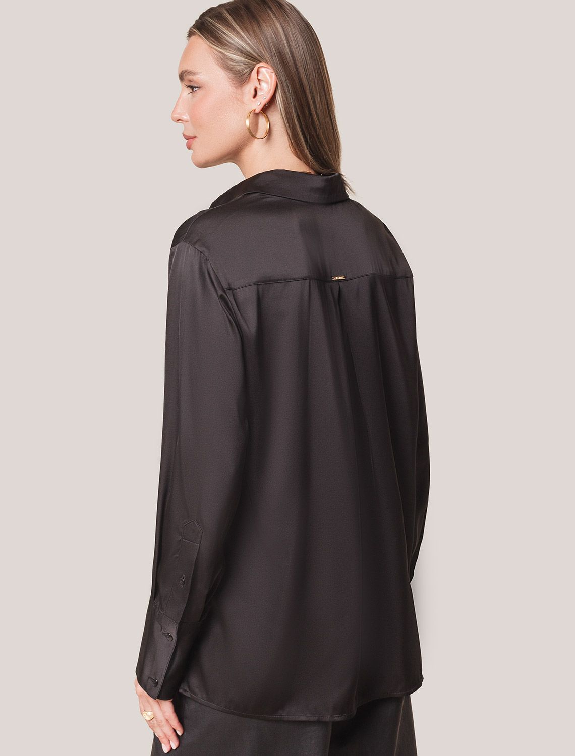 Сатиновая блузка с эластаном в черном цвете – воплощение элегантности и комфорта. Благородный блеск сатина добавляет образу шика, а эластичность материала гарантирует удобство при носке. Прямой силуэт блузки обеспечивает комфорт, а эластичность материала предотвращает деформацию. Застежка-планка с потайными пуговицами придает модели аккуратность. Универсальный вариант для casual-образов.