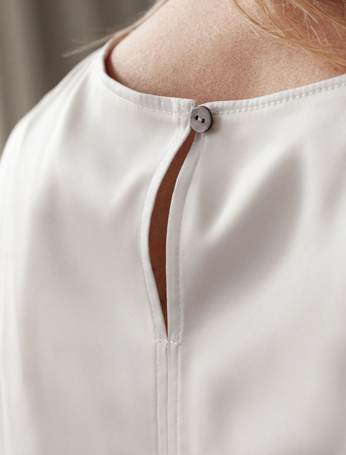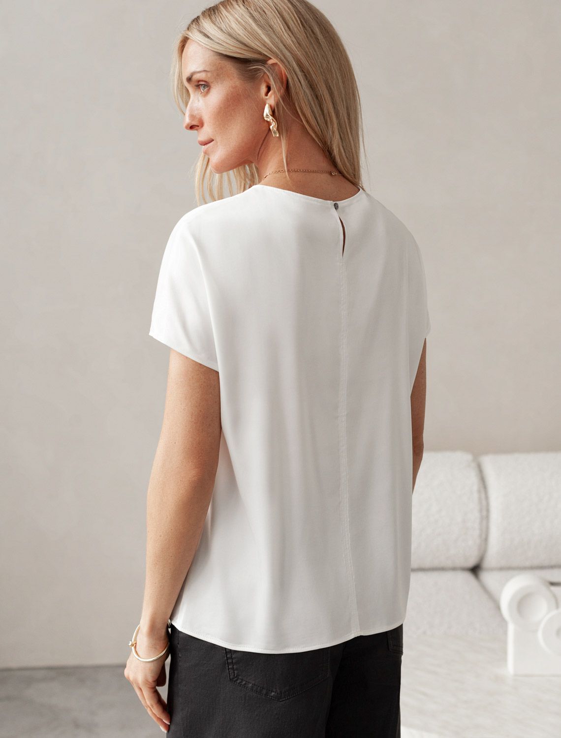 Стильная блузка натурального белого цвета из сатина с удобной застежкой на пуговицу на спинке. Прямой крой и короткий рукав делают модель универсальной для любого сезона. Благородный блеск ткани подчеркивает элегантность, а удобная посадка обеспечивает комфорт. Благодаря эластану в составе ткань сохраняет первозданный вид, не образуя заломов. Ваш образ будет безупречен весь день! Блузка легко комбинируется с деловой одеждой и casual-вещами, подходит для разных случаев.