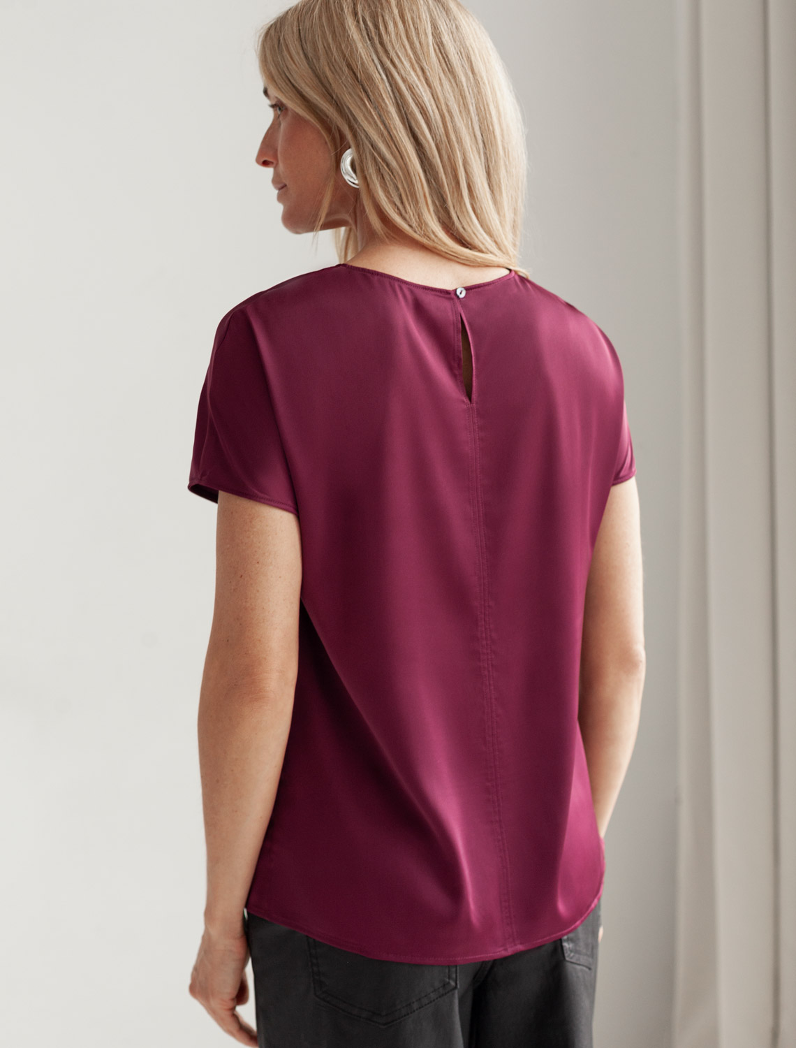 Стильная блузка винного цвета из сатина с удобной застежкой на пуговицу на спинке. Прямой крой и короткий рукав делают модель универсальной для любого сезона. Благородный блеск ткани подчеркивает элегантность, а удобная посадка обеспечивает комфорт. Благодаря эластану в составе ткань сохраняет первозданный вид, не образуя заломов. Ваш образ будет безупречен весь день! Блузка легко комбинируется с деловой одеждой и casual-вещами, подходит для разных случаев. винный