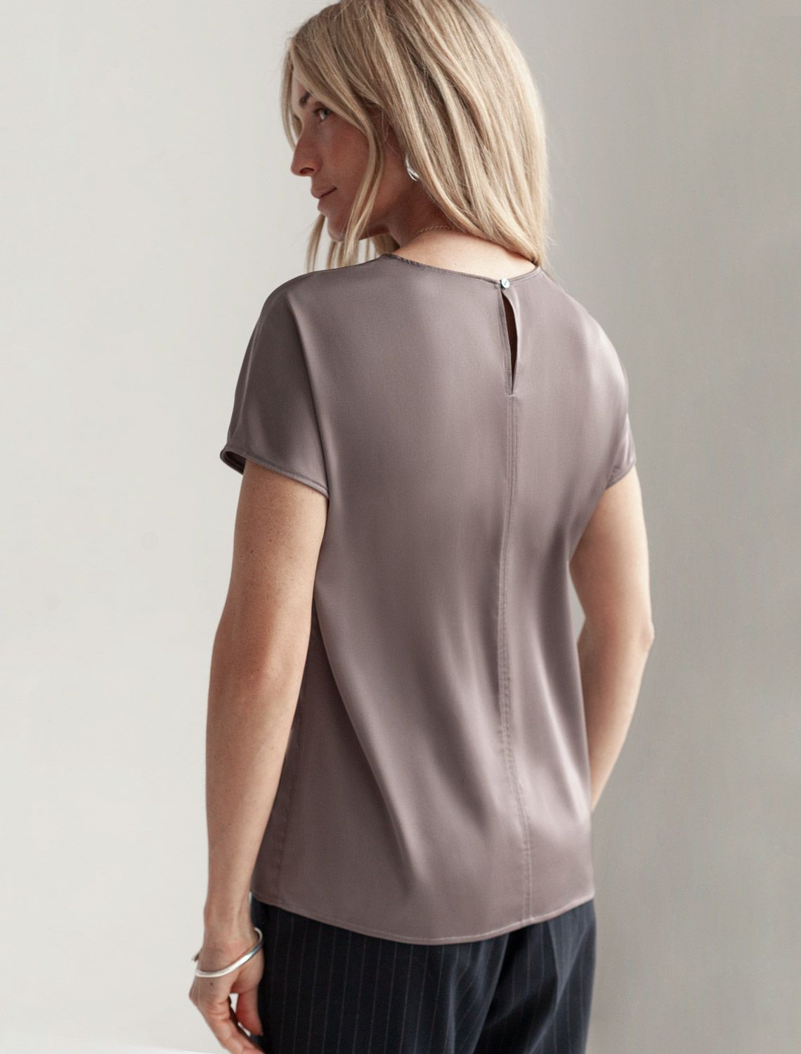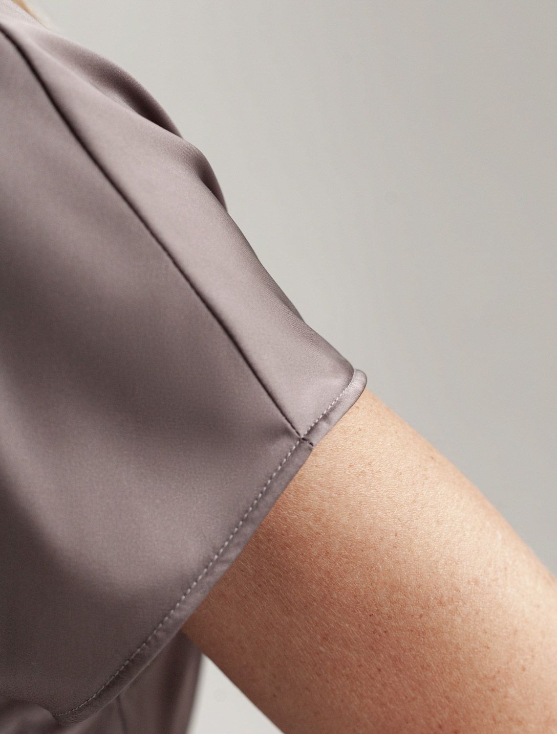 Стильная блузка кофейного цвета из сатина с удобной застежкой на пуговицу на спинке. Прямой крой и короткий рукав делают модель универсальной для любого сезона. Благородный блеск ткани подчеркивает элегантность, а удобная посадка обеспечивает комфорт. Благодаря эластану в составе ткань сохраняет первозданный вид, не образуя заломов. Ваш образ будет безупречен весь день! Блузка легко комбинируется с деловой одеждой и casual-вещами, подходит для разных случаев.