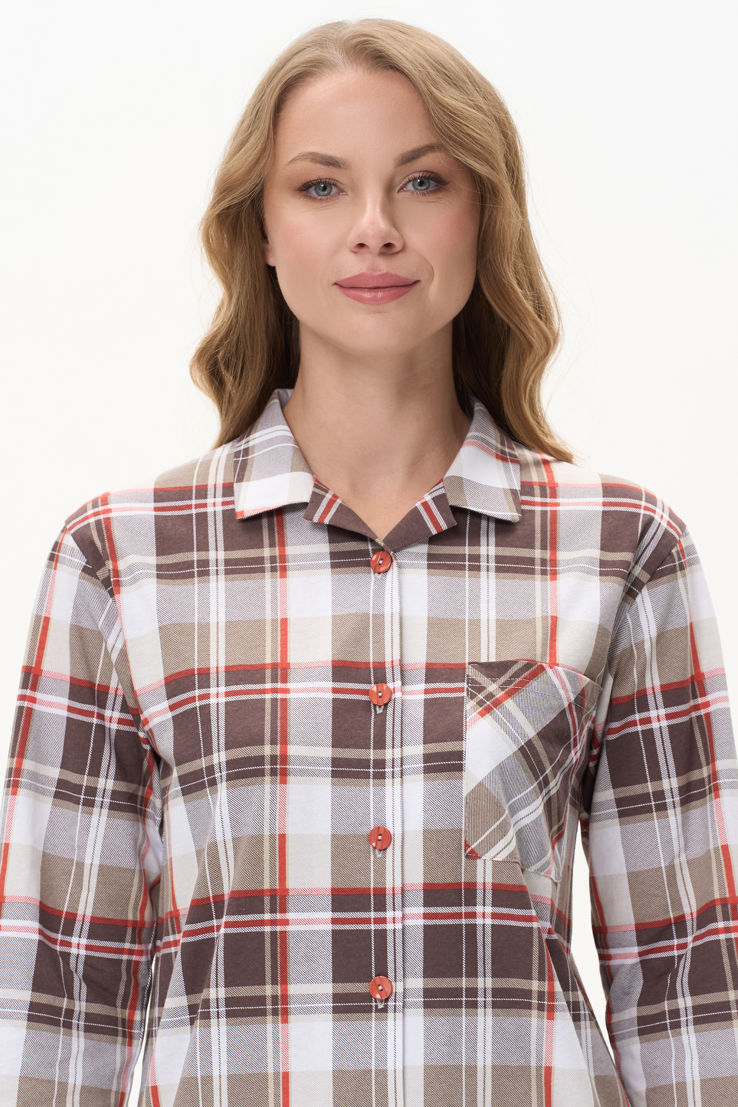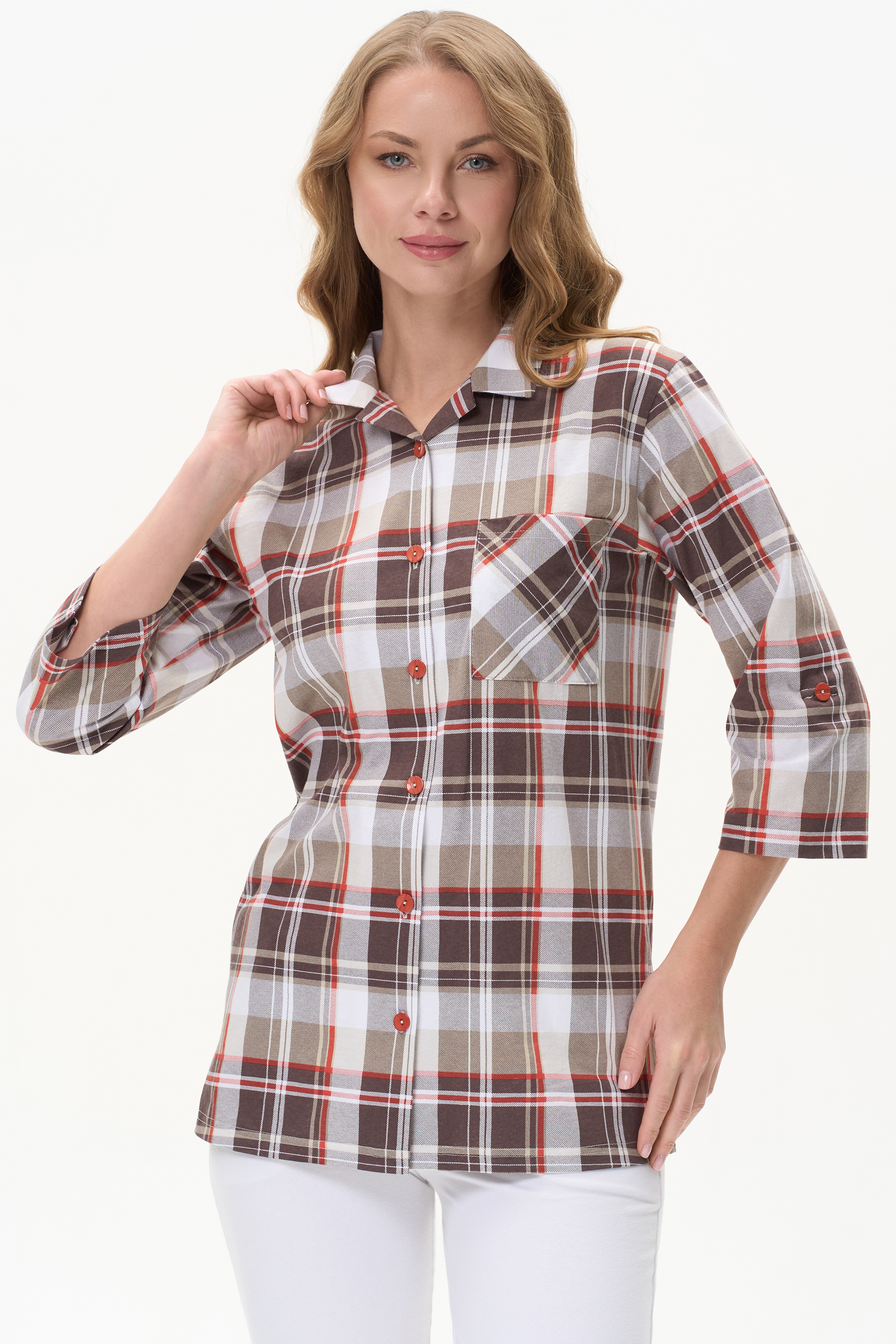 Рубашка прямого силуэта с отложным воротником из хлопкового полотна. Застежка на пуговицы. Накладной карман, по низу разрезы в боковых швах. Втачные рукава 3/4 с патами и пуговицами.Рост модели 175 см.