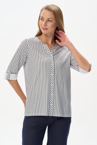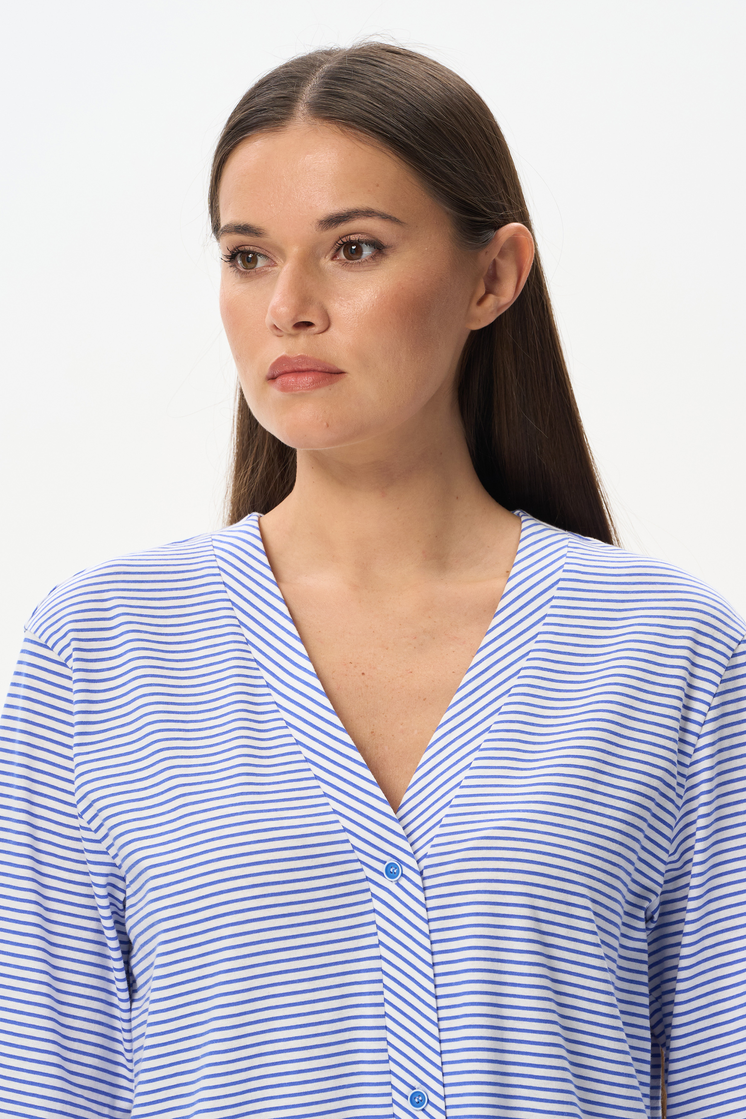 Блузка из кулирка качества ПЕ 150 гр рисунок - полоски в оттенках Яркий синий и Чистый белый. Модель свободная, прямого силуэта, V-образный вырез горловины и борт обработаны широкой планкой по-косой, застёжка на изящные пуговицы. Рукава свободные, длиной 3/4, с широкими подворотами, которые позволяют регулировать длину рукавов. Лёгкая, комфортная блузка для летнего сезона. Рост модели 175 см