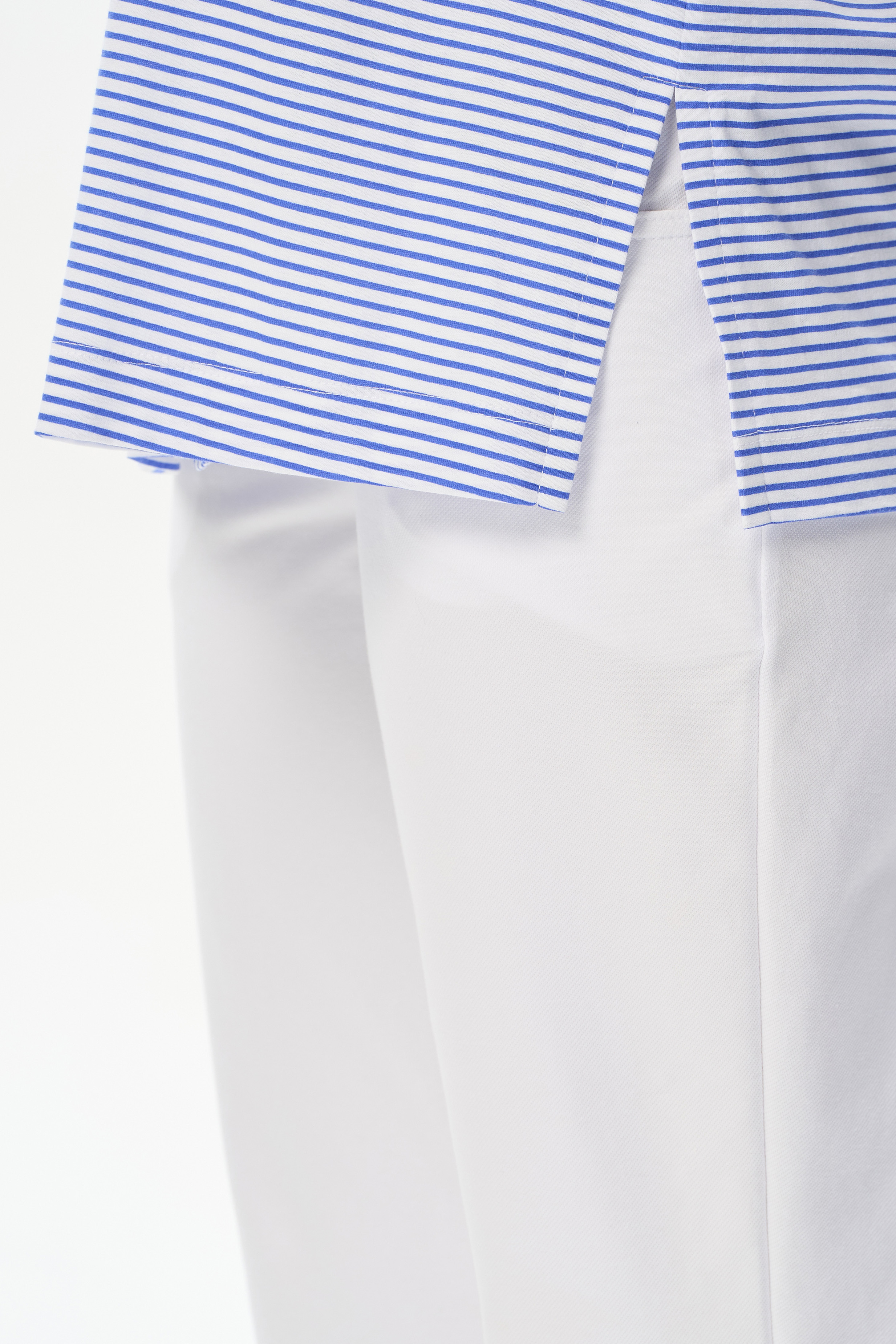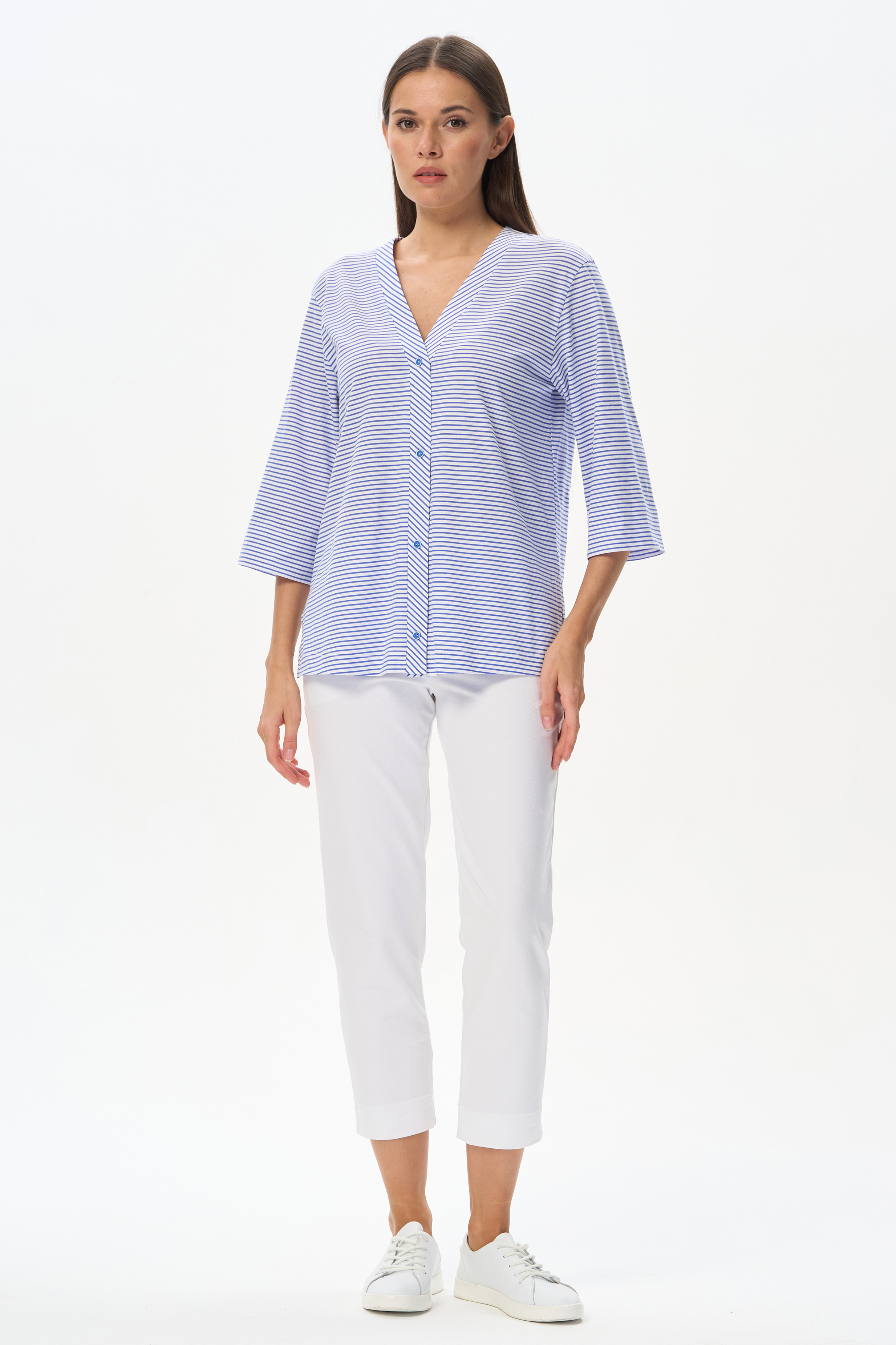 Блузка из кулирка качества ПЕ 150 гр рисунок - полоски в оттенках Яркий синий и Чистый белый. Модель свободная, прямого силуэта, V-образный вырез горловины и борт обработаны широкой планкой по-косой, застёжка на изящные пуговицы. Рукава свободные, длиной 3/4, с широкими подворотами, которые позволяют регулировать длину рукавов. Лёгкая, комфортная блузка для летнего сезона. Рост модели 175 см