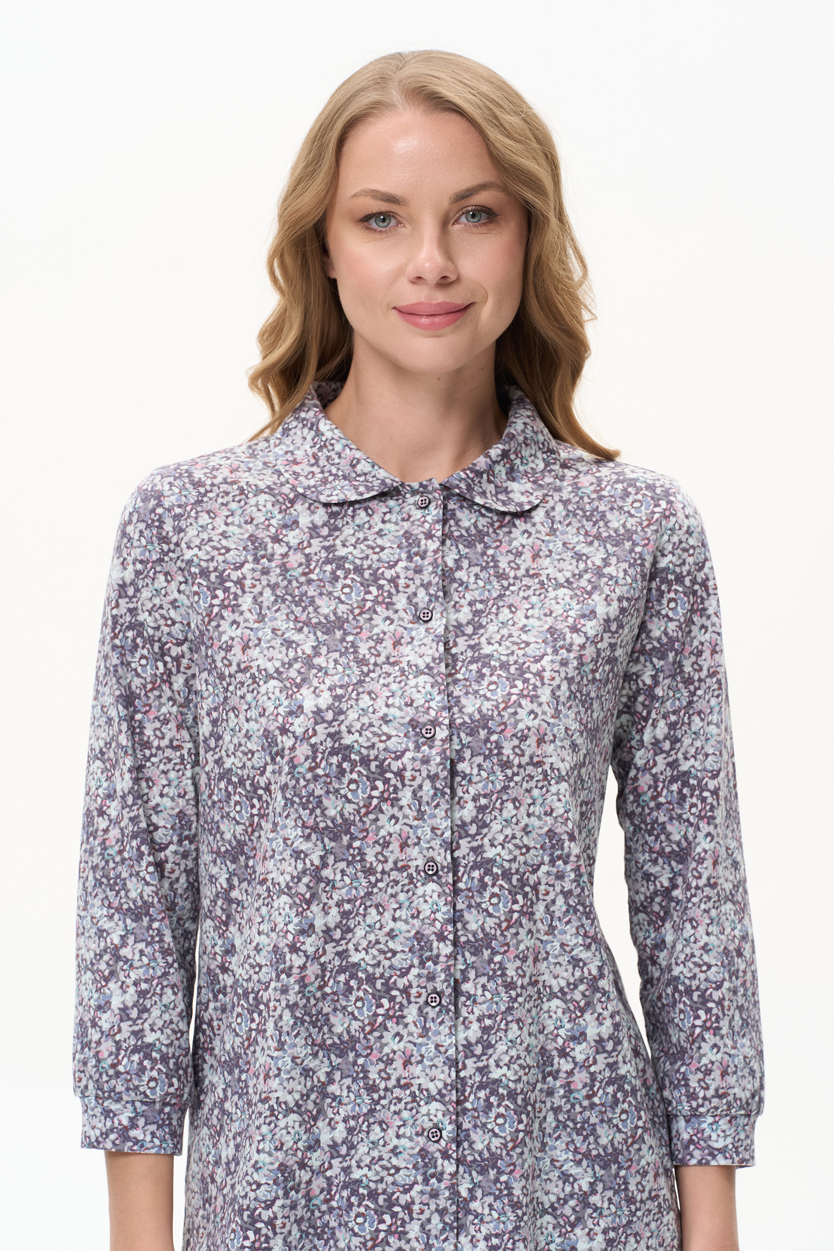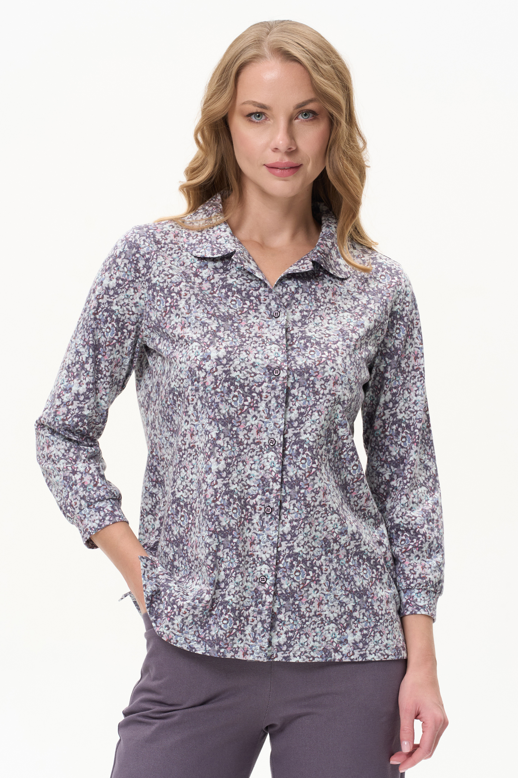 Блузка прямого силуэта из хлопкового трикотажного полотна. Отложной воротник, застежка на пуговицы. Укороченные втачные рукава, манжеты из трикотажного полотна рибана. Рост модели 175 см.