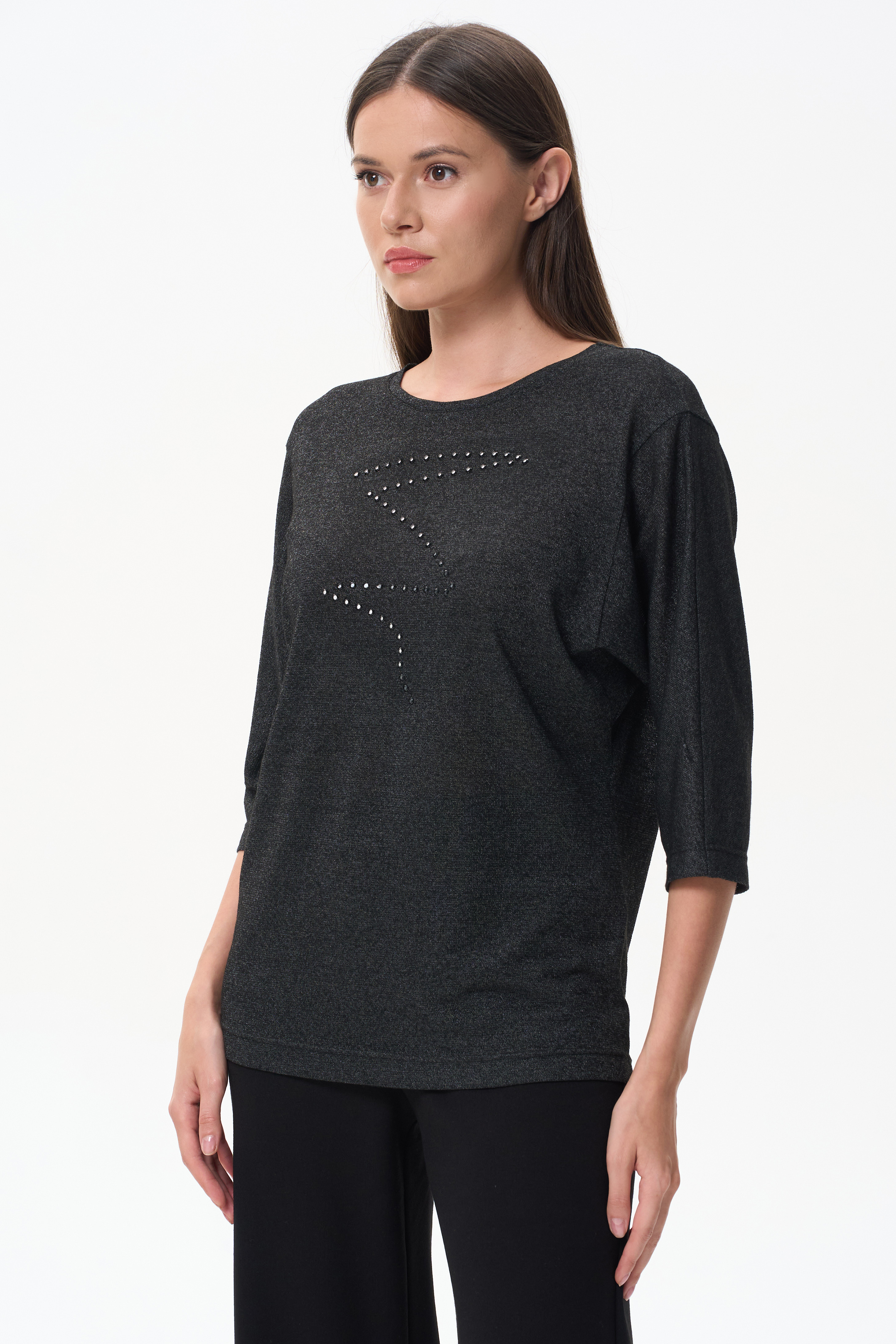 Нарядная свободная блузка из тонкого трикотажа с серебристым блеском. Рукава летучая мышь длиной 3/4, округлый вырез горловины, на полочке дизайнерский рисунок из чёрных страз. Блузка полупрозрачная с трендовым метализированным эффектом.