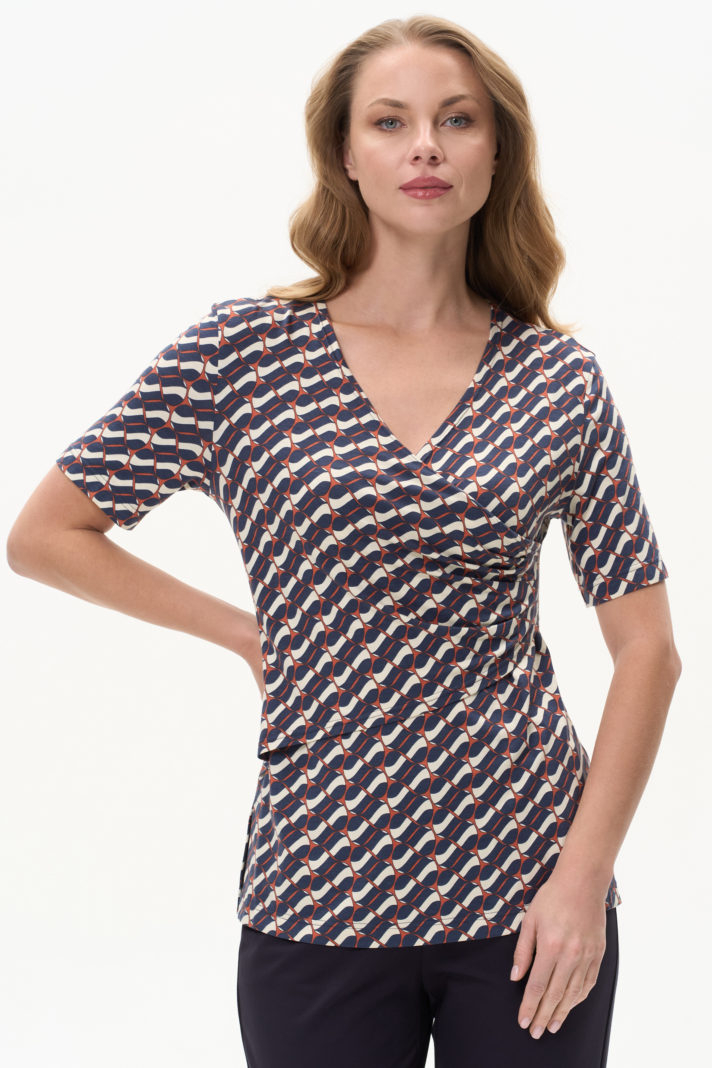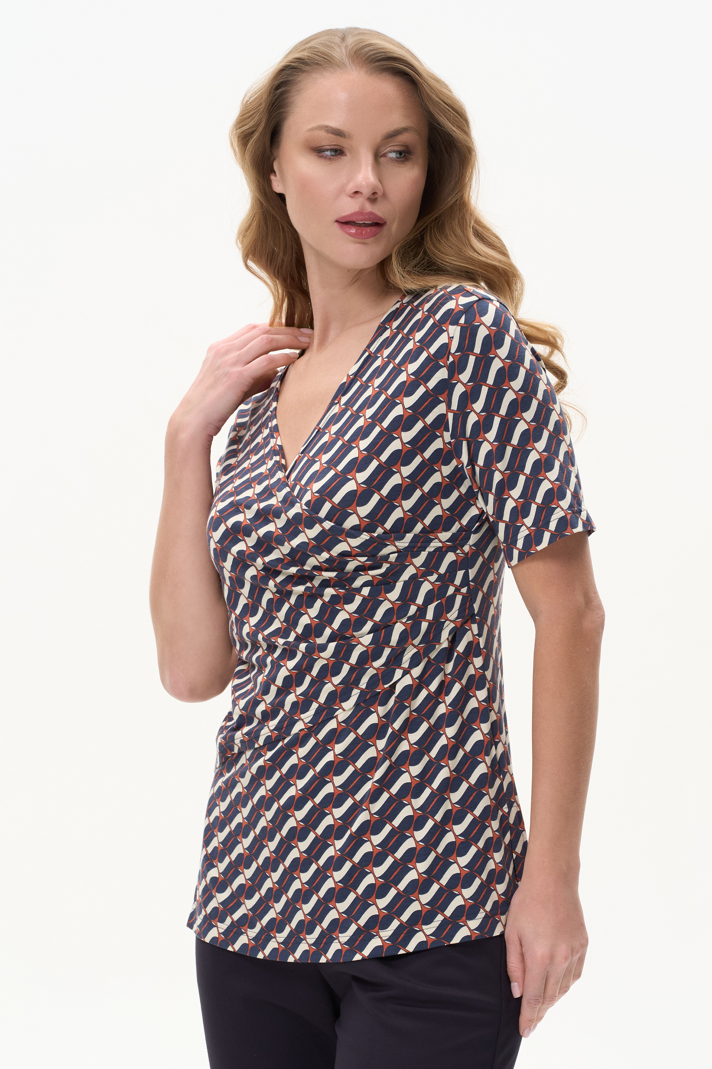 Блузка из вискозы с Графическим рисунком в стиле Gucci асимметричного кроя с имитацией запаха, высокие разрезы в боковых швах, рукава до локтя. Драпировка на полочке скрывает недостатки фигуры. Рост модели 175 см