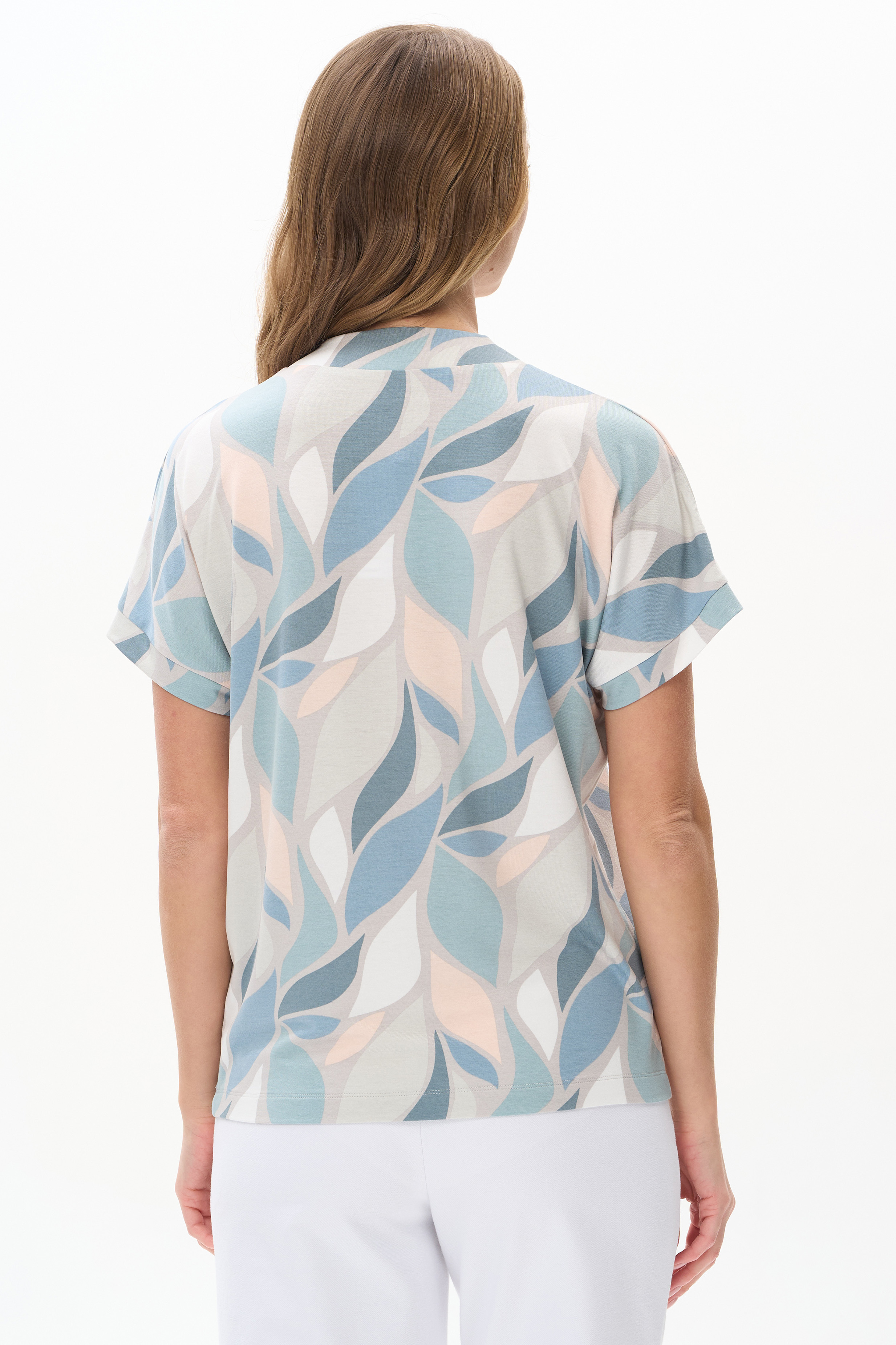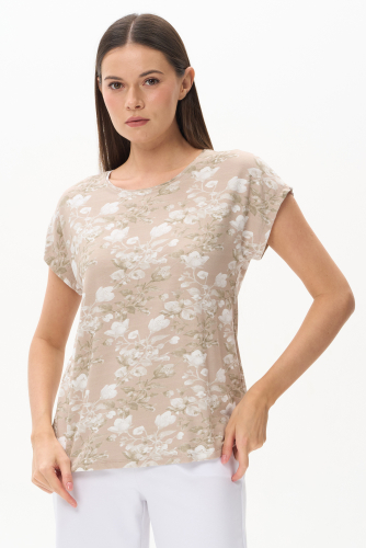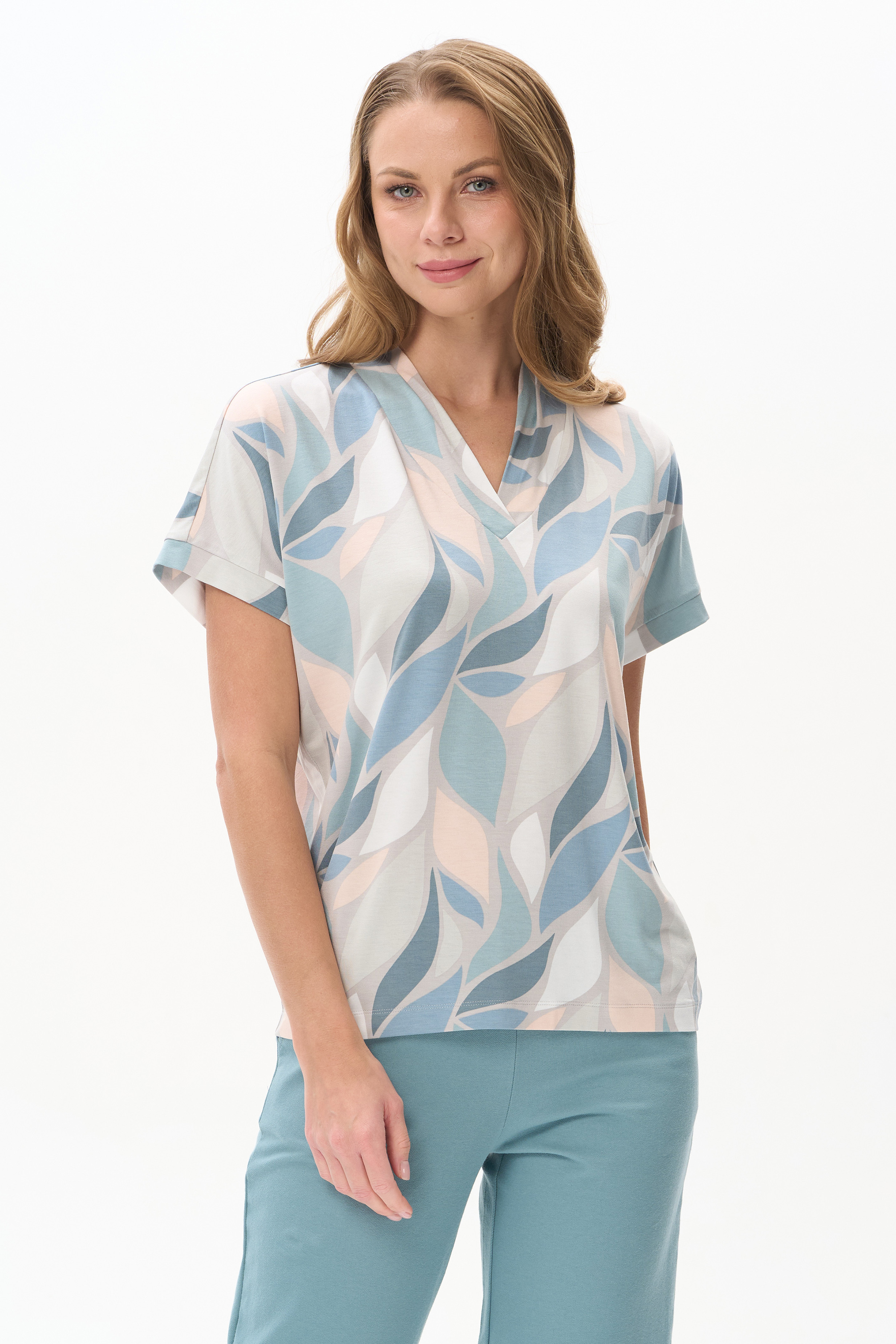 Нарядная блузка из тонкой шелковистой вискозы качества вортекс c дизайнерским рисунком растительная абстракция Модель со складками на воротнике - а-ля «апаш» в стиле пятидесятых, что придает изделию необыкновенную женственность. Рукава короткие с заниженной проймой. Эта приятная модель - идельный союзник для всех низов коллекции Рост модели 175 см