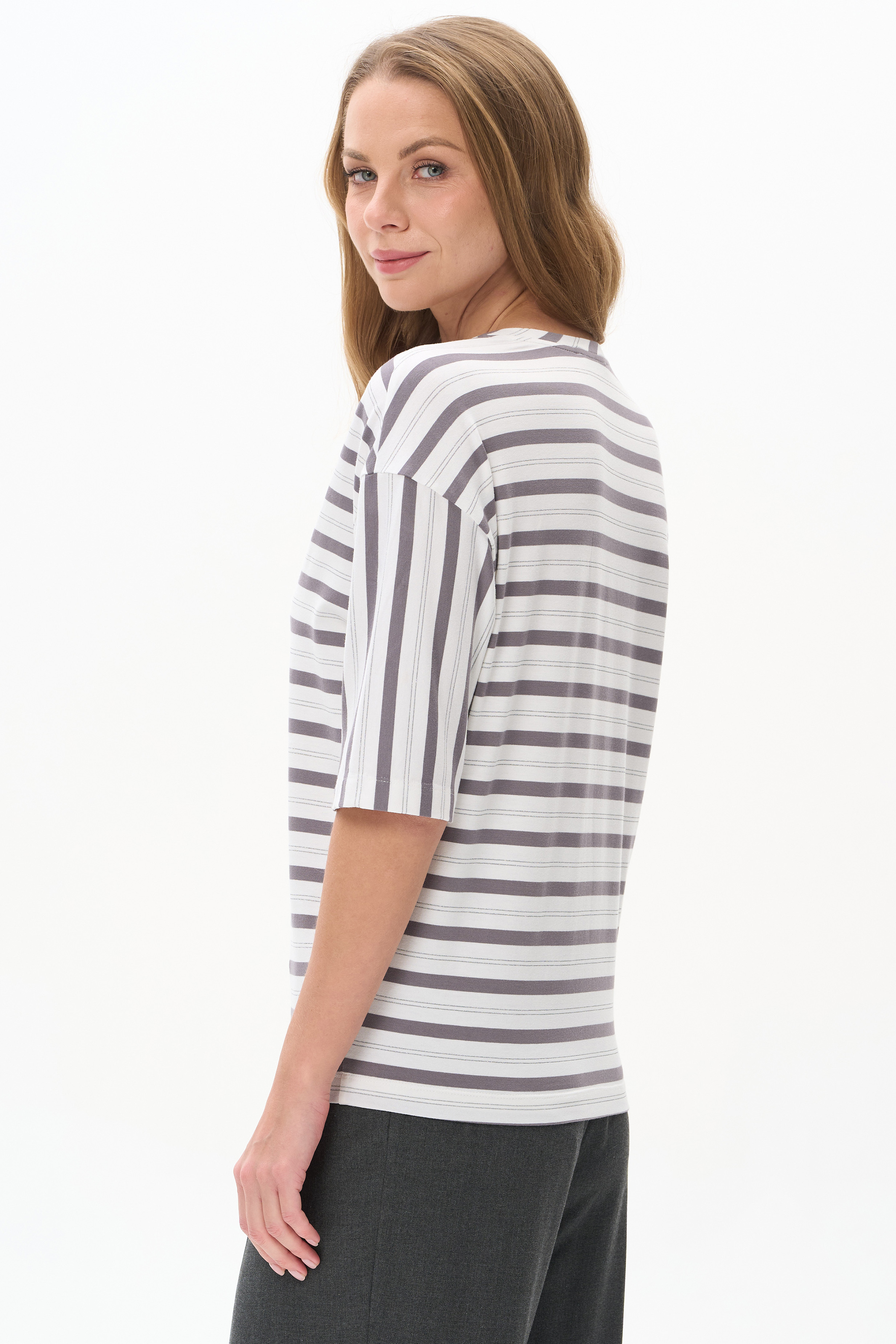 Эффектная блузка нового силуэта - свободная в плечевом поясе и прилегающая по бедрам, из вискозного полотна в полоску. Модель с V-вырезом горловины, спущеная линия плеча, длина рукавов за локоть. Игра полосок добавляет энергии этой модели. Рост модели 175 см