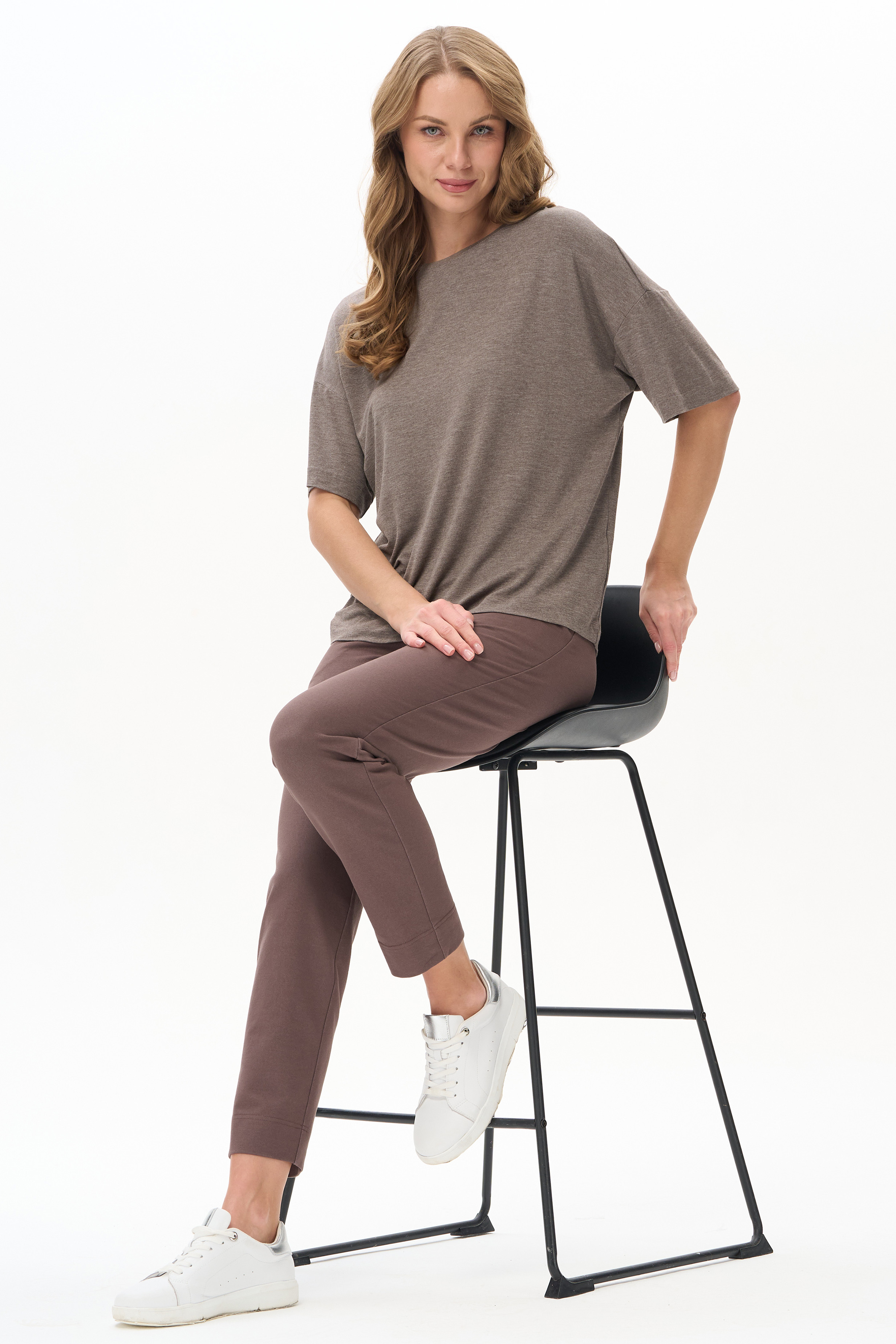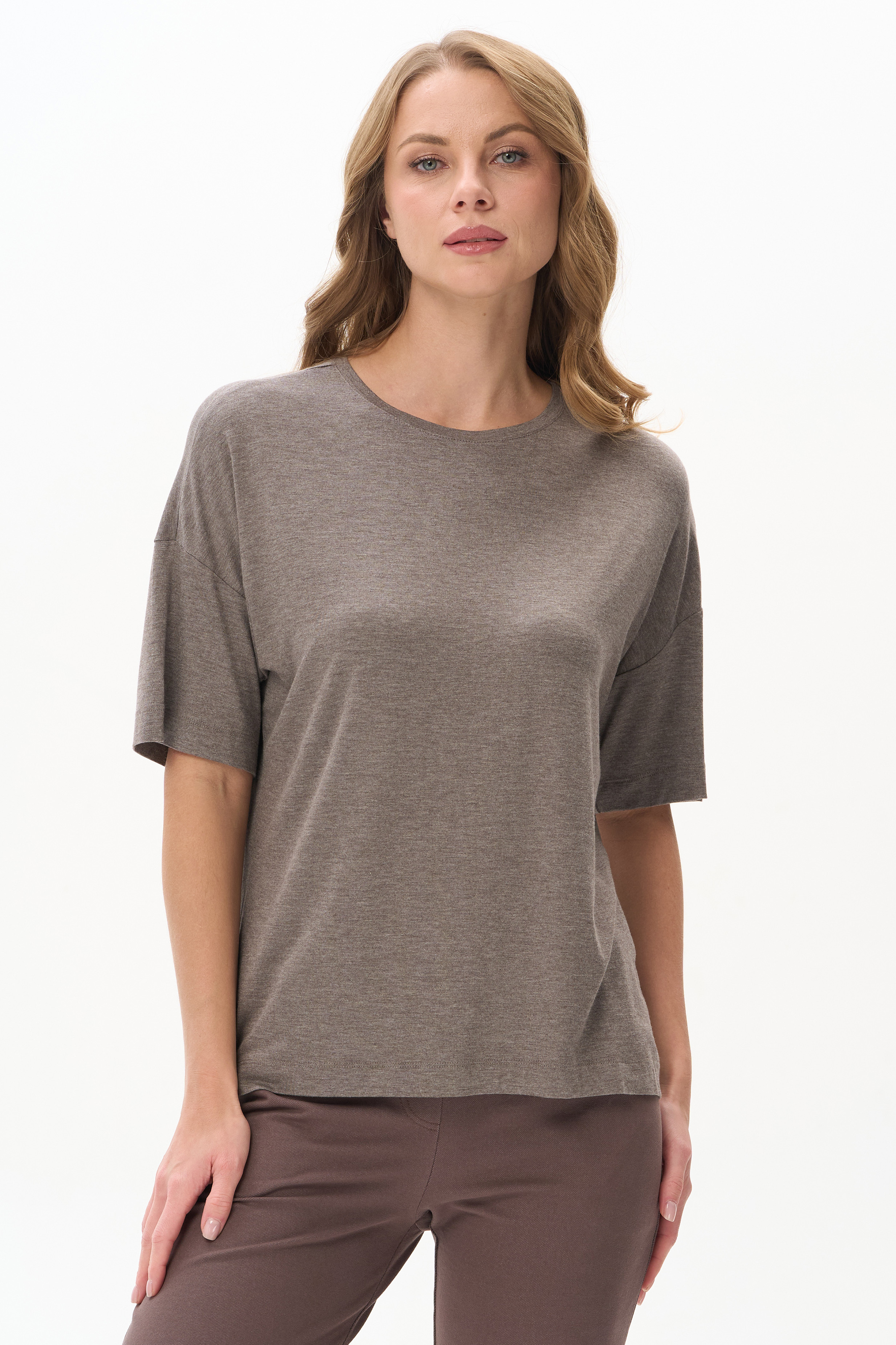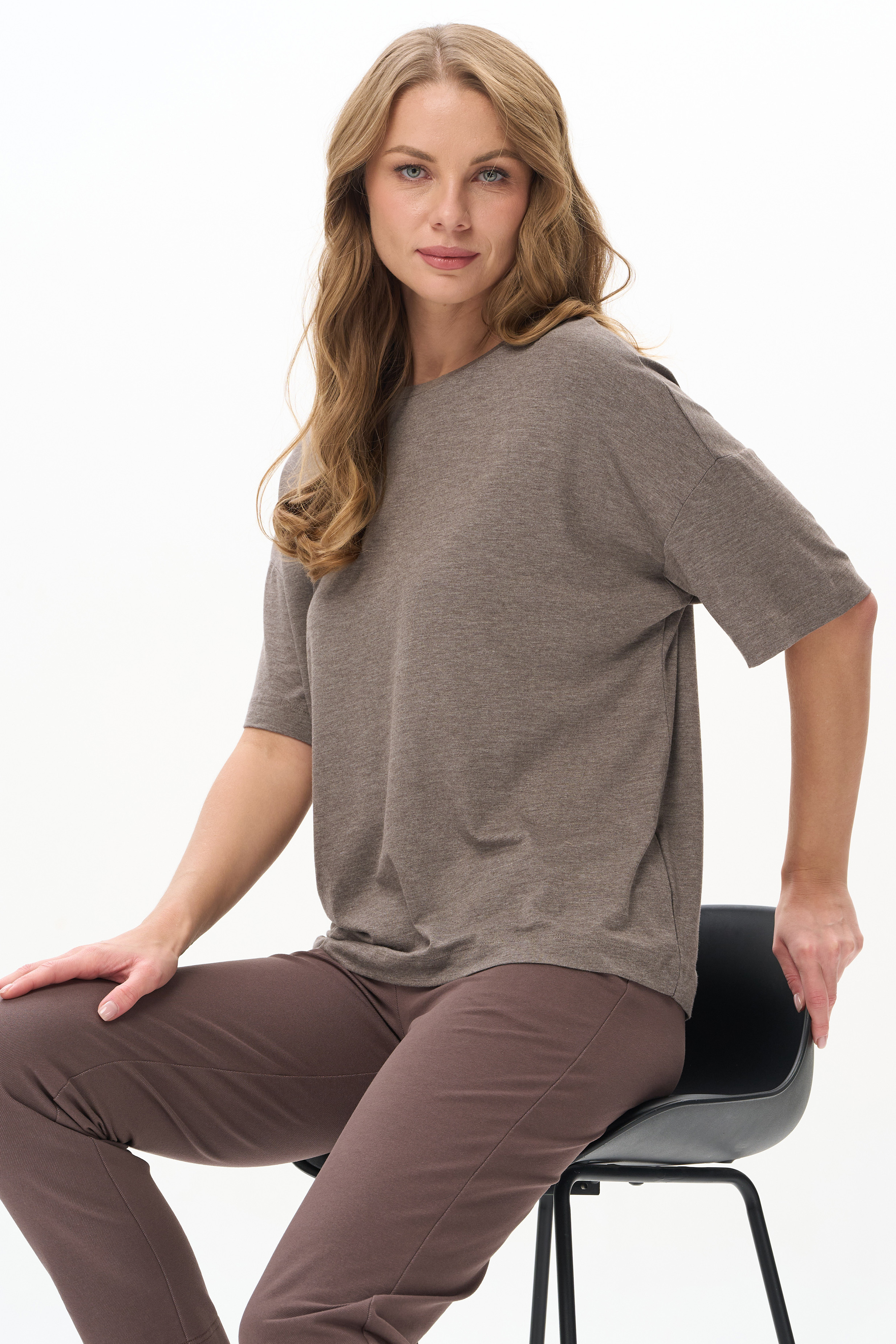 Эффектная блузка из меланжевого вискозного полотна 200 гр в оттенке Шоколад. Модель с круглым вырезом горловины, спущеная линия плеча, длина рукавов за локоть. Лёгкая, свободная, очень приятная к телу. Рост модели 175 см