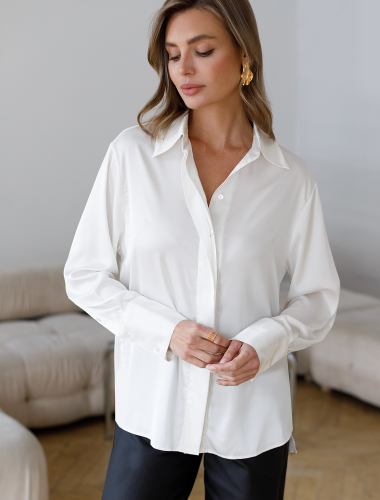 Блузка прилегающего силуэта выполнена из формоустойчивого хлопка. Фишкой изделия служат парные контрастные пуговицы. На спинке фирменный металлический логотип бренда. Изделие хорошо держит форму, подчеркивает силуэт и подходит для любой фигуры. Идеальный вариант для респектабельных образов в деловом стиле.