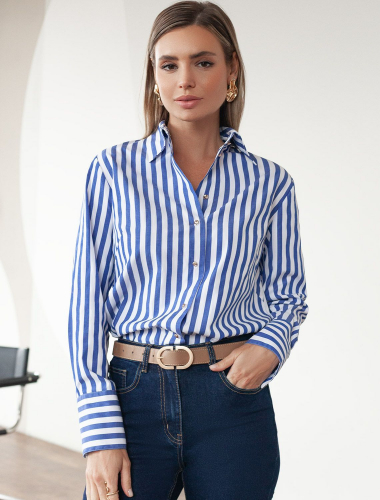Блузка прилегающего силуэта выполнена из формоустойчивого хлопка. Фишкой изделия служат парные контрастные пуговицы. На спинке фирменный металлический логотип бренда. Изделие хорошо держит форму, подчеркивает силуэт и подходит для любой фигуры. Идеальный вариант для респектабельных образов в деловом стиле.