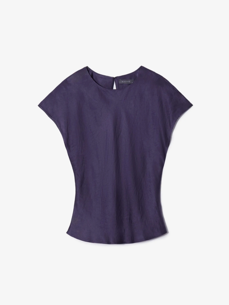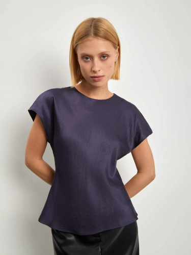 Элегантная блуза тёмно-виноградного оттенка из гладкой вискозы с жатым эффектом станет незаменимой в гардеробе. Она подходит и на каждый день, и для более торжественных случаев. Красиво садится за счёт кроя по косой. Модель имеет ярко выраженный приталенный силуэт. Выполнена с цельнокроеным коротким рукавом и круглым вырезом, сзади под застёжкой есть вырез-капля. Застёгивается на крючки. Изготовлена без подкладки. Блуза сделает интереснее образы с базовым низом, будет сочетаться с трендовыми брюками и юбками из экокожи
