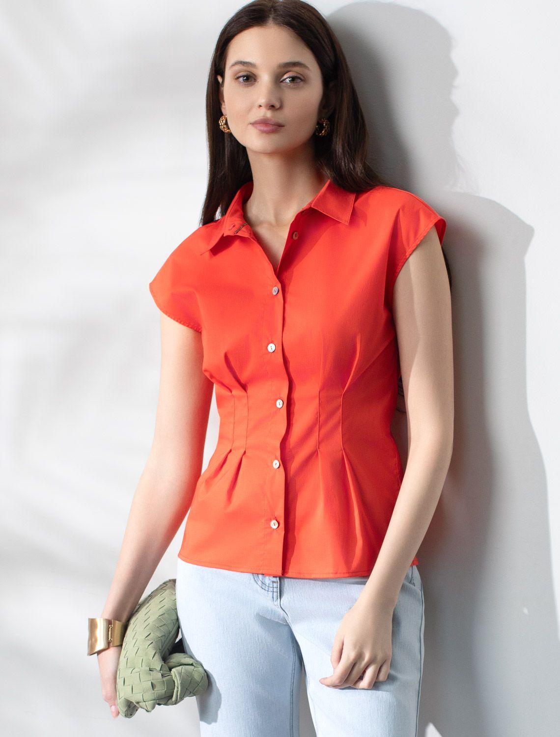 Изысканная женственная блузка кораллового цвета выполнена из легкого хлопкого поплина плотностью 96 Г/м2 и будет идеальна для создания комфортного и красивого образа в теплое время года. Натуральный материал отличается мягкостью и воздухопроницаемостью, что особенно ценно в жаркую погоду, а эластан в составе позволяет сохранить форму изделия. Основное преимущество повседневной блузки — аккуратный приталенный силуэт, подчеркивающий достоинства фигуры и создающий акцент на линии талии. Короткий цельнокроеный рукав придает образу свежесть и легкость. Однотонная рубашка с отложным воротничком подойдет для работы в офисе, встреч с друзьями, прогулок, для особого случая или праздника. Лаконичная легкая блузка отлично сочетается с разнообразными элементами гардероба, благодаря ей можно создать классический или романтичный образ.