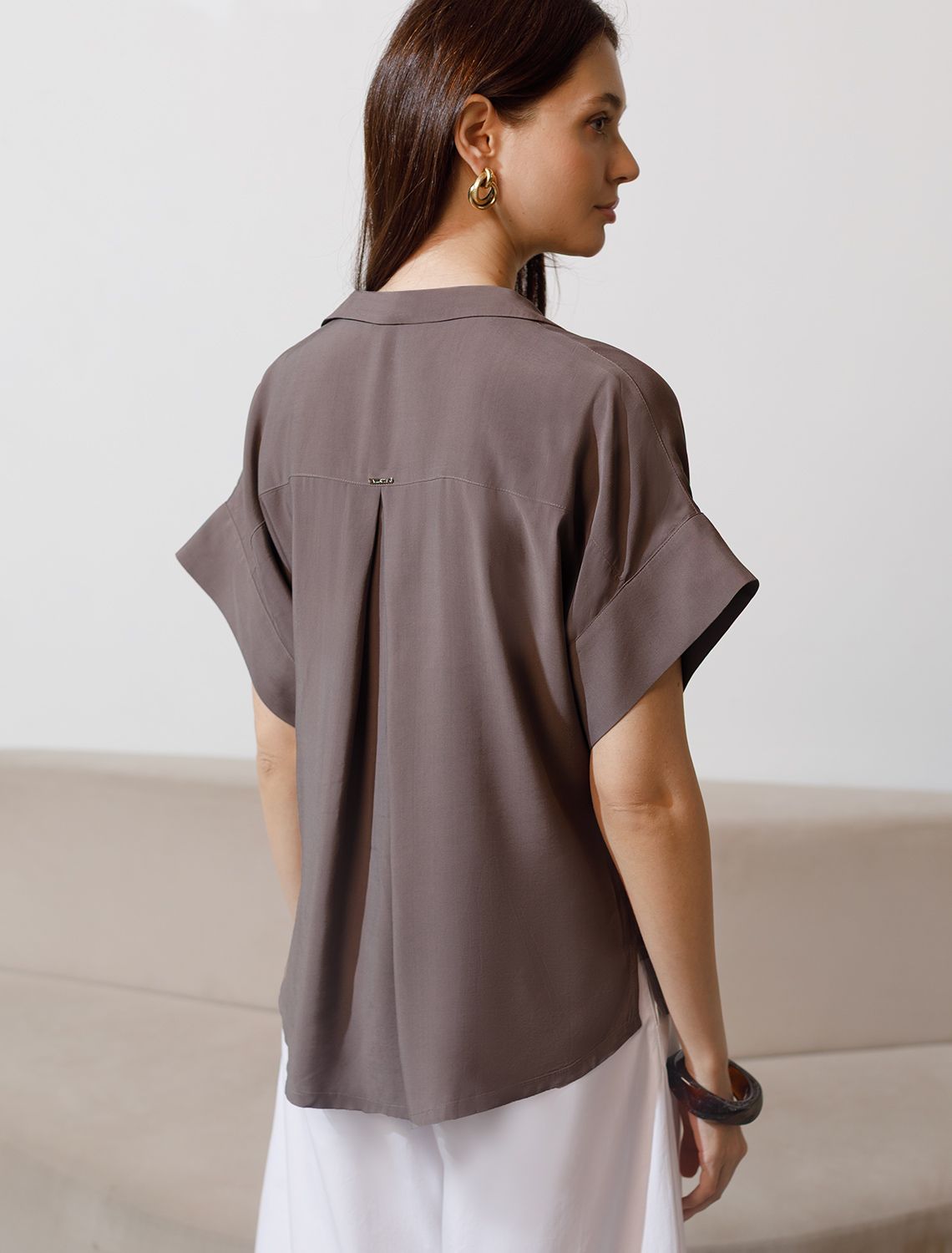 Блузка кофейного цвета сочетает в себе комфорт и элегантность благодаря материалу из вискозы с лиоцеллом. Аккуратный отложной воротник подчеркивает утонченность образа, а широкие короткие рукава привлекают внимание и делают силуэт современным. Спущенная линия плеча формирует расслабленный, но стильный внешний вид, что идеально для тех, кто ценит индивидуальность и уверенность в деталях. Крой продуман так, чтобы подчеркивать достоинства фигуры и на больших размерах, создавая гармоничный силуэт без лишних усилий. Ткань из вискозы с добавлением лиоцелла обеспечивает приятные ощущения и отличную посадку, струится на теле и охлаждает в жаркую погоду. При пошиве использована технология «чистый край» по всей длине центральной планки и низу изделия. Это признак премиум качества — «чистый край» вместо оверлока. Блузку можно носить с топом, не застегивая — при этом распахнутая блузка будет выглядеть максимально эстетично. Рубашка легко впишется как в деловой гардероб, так и в повседневный стиль, позволяя выглядеть безупречно независимо от ситуации.