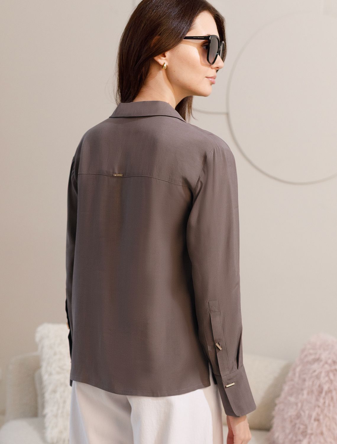 Блузка кофейного цвета сочетает в себе комфорт и элегантность благодаря материалу из вискозы с лиоцеллом. Аккуратный отложной воротник подчеркивает утонченность образа, а продолговатые металлические пуговицы золотистого цвета добавляют выразительный акцент и придают блузке благородный вид. Широкие манжеты на рукавах привлекают внимание и делают силуэт современным. Спущенная линия плеча формирует расслабленный, но стильный внешний вид, что идеально для тех, кто ценит индивидуальность и уверенность в деталях. Крой продуман так, чтобы подчеркивать достоинства фигуры и на больших размерах, создавая гармоничный силуэт без лишних усилий. Ткань из вискозы с добавлением лиоцелла обеспечивает приятные ощущения и отличную посадку, струится на теле и охлаждает в жаркую погоду. При пошиве использована технология «чистый край» по всей длине центральной планки и низу изделия. Это признак премиум качества — «чистый край» вместо оверлока. Блузку можно носить с топом, не застегивая — при этом распахнутая блузка будет выглядеть максимально эстетично.Рубашка легко впишется как в деловой гардероб, так и в повседневный стиль, позволяя выглядеть безупречно независимо от ситуации.