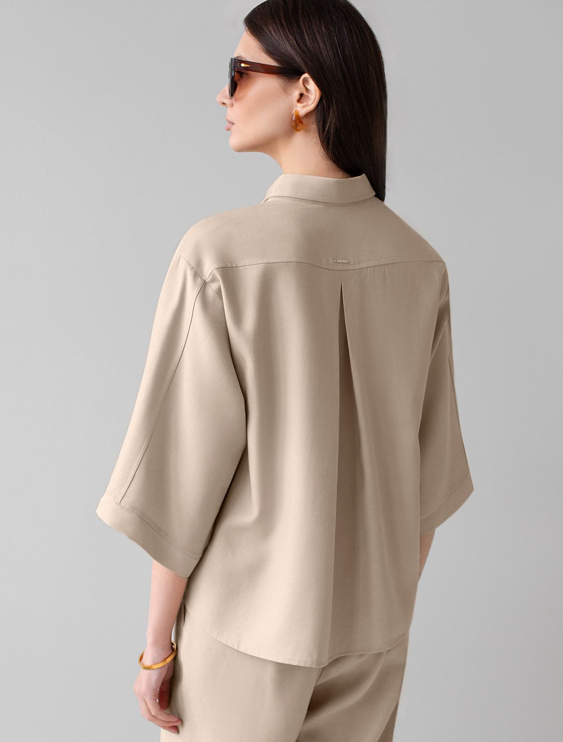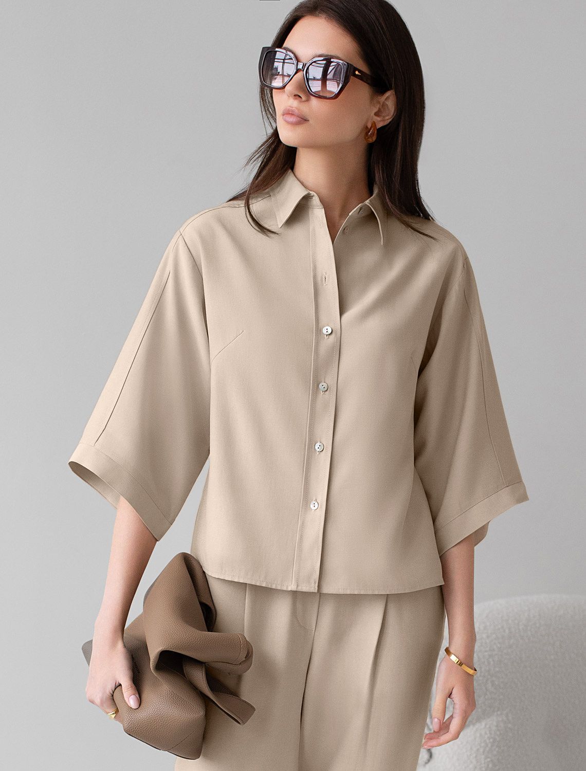 Стильная блузка светло-бежевого цвета выполнена из плотного лиоцелла. Лиоцелл это более дорогой и экологичный вариант вискозы, очень прочный и шелковистый. Модель дополнена широкими рукавами длиной 3/4, создающими модный акцент. Классический отложной воротник придает блузке официальность и идеально подходит для ношения, где требуется офисный дресс-код. А лаконичные лампасы вдоль рукавов в тон основного цвета подчеркивают трендовый характер блузки. Это ненавязчивый, но заметный акцент, который выделяет модель среди стандартных классических блузок. Свободный крой не сковывает движений и отлично садится по фигуре даже на большие размеры, скрывая возможные недостатки. Эта легкая рубашка с застежкой на пуговицы идеальный выбор для комфорта и стиля в теплое время года, она идеально подойдет для любого повода..