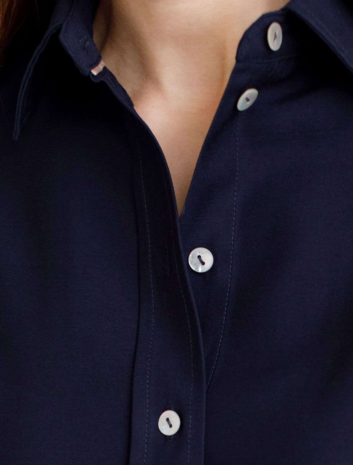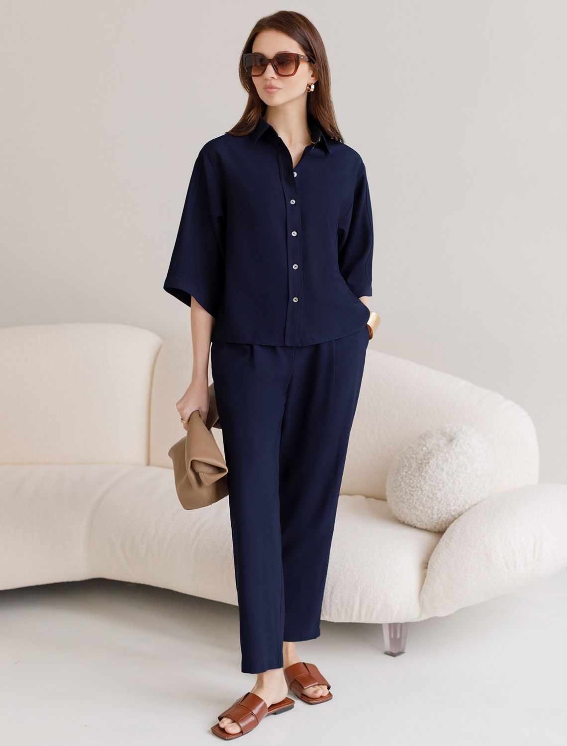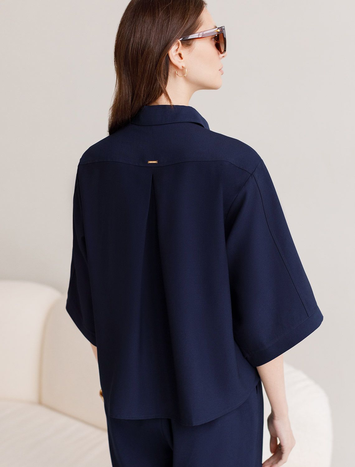 Стильная блузка темно-синего цвета выполнена из плотного лиоцелла. Лиоцелл это более дорогой и экологичный вариант вискозы, очень прочный и шелковистый. Модель дополнена широкими рукавами длиной 3/4, создающими модный акцент. Классический отложной воротник придает блузке официальность и идеально подходит для ношения, где требуется офисный дресс-код. А лаконичные лампасы вдоль рукавов в тон основного цвета подчеркивают трендовый характер блузки. Это ненавязчивый, но заметный акцент, который выделяет модель среди стандартных классических блузок. Свободный крой не сковывает движений и отлично садится по фигуре даже на большие размеры, скрывая возможные недостатки. Эта легкая рубашка с застежкой на пуговицы идеальный выбор для комфорта и стиля в теплое время года, она идеально подойдет для любого повода.