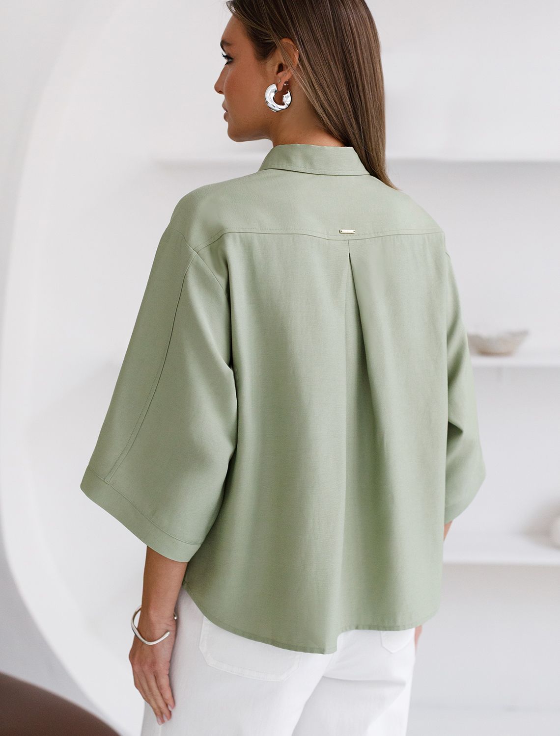 Стильная блузка светло-зеленого цвета выполнена из плотного лиоцелла. Лиоцелл это более дорогой и экологичный вариант вискозы, очень прочный и шелковистый. Модель дополнена широкими рукавами длиной 3/4, создающими модный акцент. Классический отложной воротник придает блузке официальность и идеально подходит для ношения, где требуется офисный дресс-код. А лаконичные лампасы вдоль рукавов в тон основного цвета подчеркивают трендовый характер блузки. Это ненавязчивый, но заметный акцент, который выделяет модель среди стандартных классических блузок. Свободный крой не сковывает движений и отлично садится по фигуре даже на большие размеры, скрывая возможные недостатки. Эта легкая рубашка с застежкой на пуговицы идеальный выбор для комфорта и стиля в теплое время года, она идеально подойдет для любого повода.