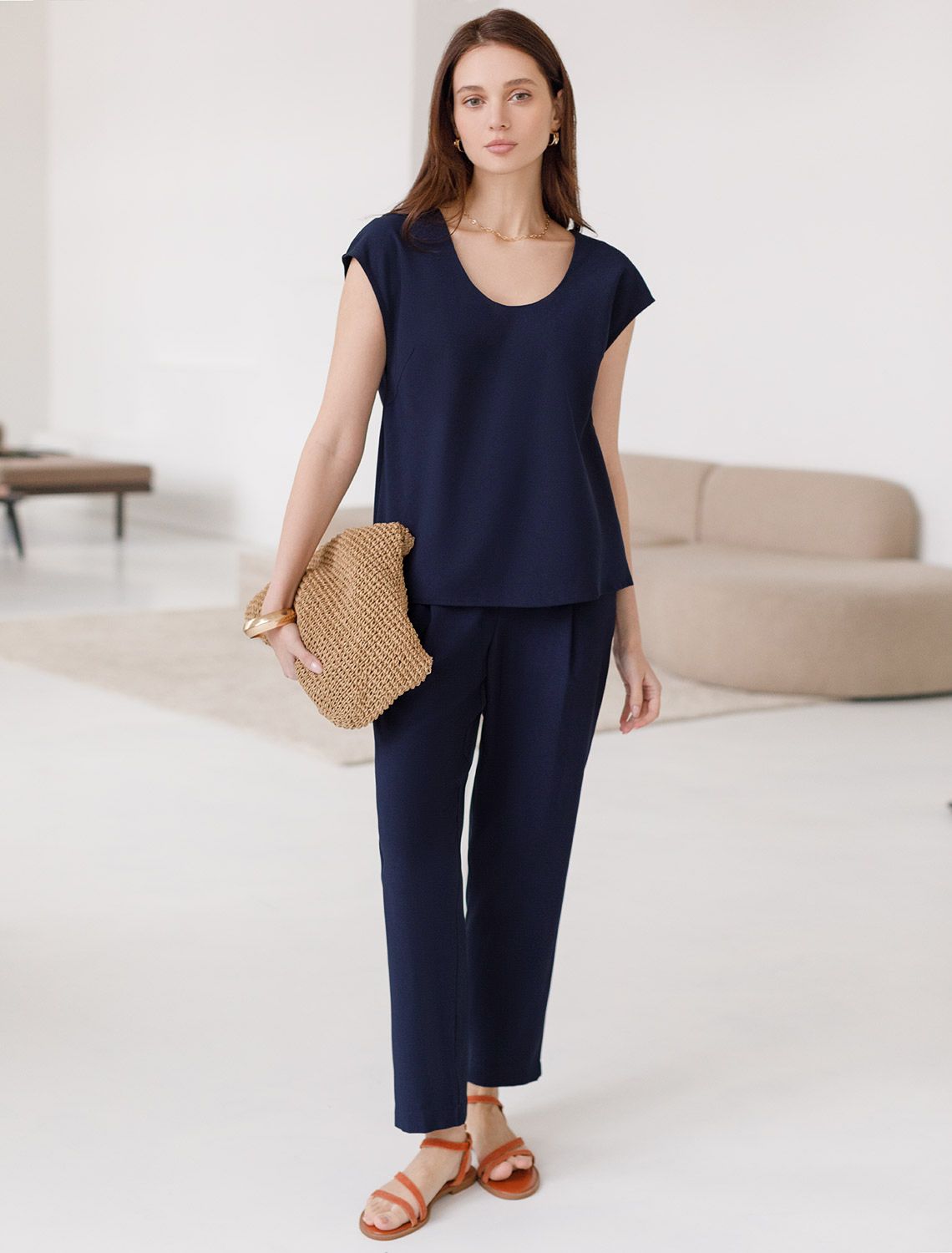 Элегантная блузка темно-синего цвета скроенная по косой выполнена из плотного лиоцелла. Лиоцелл это более дорогой и экологичный вариант вискозы, очень прочный и шелковистый. Эта повседневная блузка с трендовым U-вырезом создана для легкого и утонченного стиля. Мягкие линии кроя создают невероятно эффектный образ, который подчеркивает естественную красоту, не стесняя движений, а свободный фасон дарит ощущение абсолютного комфорта и уверенности. Блузка красиво драпируется при движении, создавая летящий, воздушный эффект. Эта легкая блуза с коротким рукавом идеальный выбор для комфорта и стиля в теплое время года, она будет идеальна для любого повода.