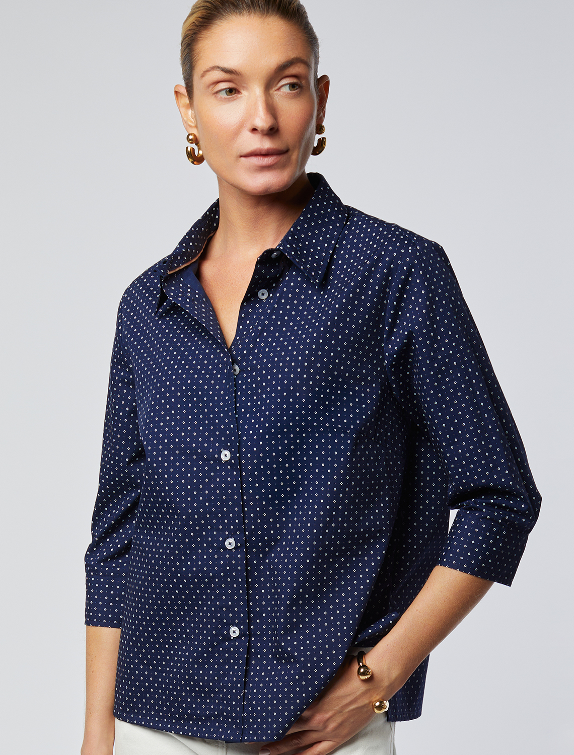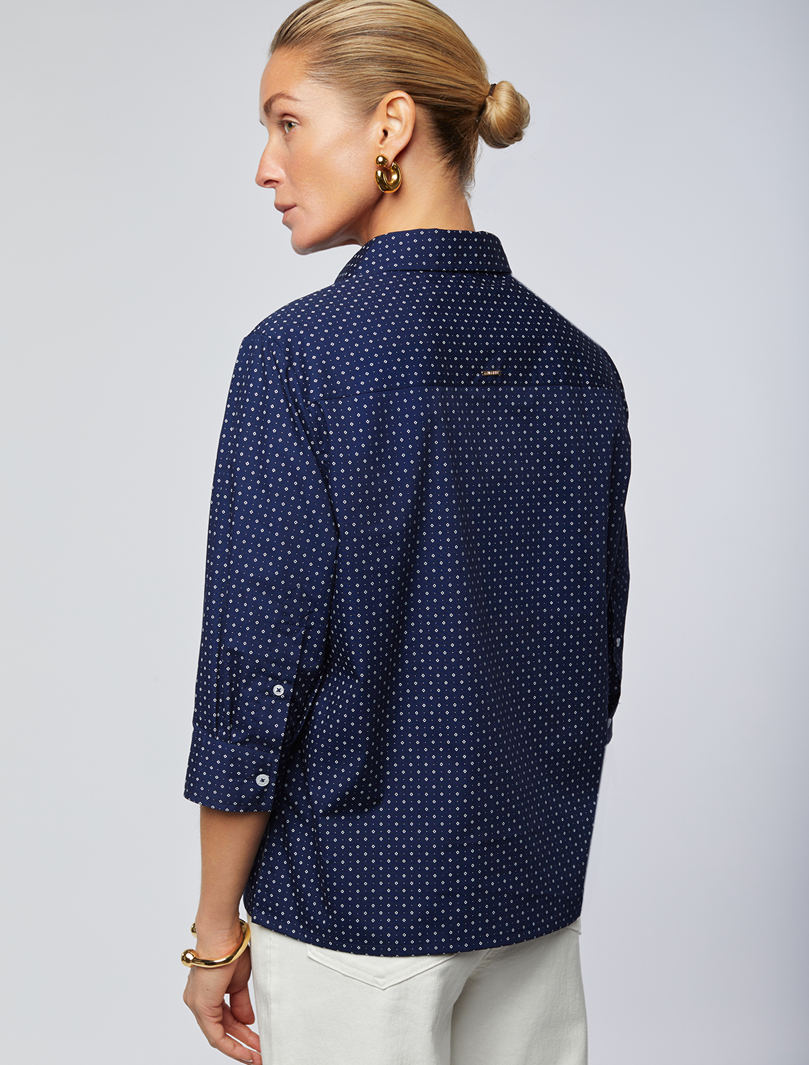 Блузка прямого кроя выполнена из хлопка. Модель с укороченным рукавом и застежкой на пуговицы из натурального перламутра. Хлопковая ткань отлично держит форму, а добавление ПЭ в составе способствует меньшей сминаемости изделия. На спинке фирменный логотип бренда золотистого цвета. темно-синий-белый