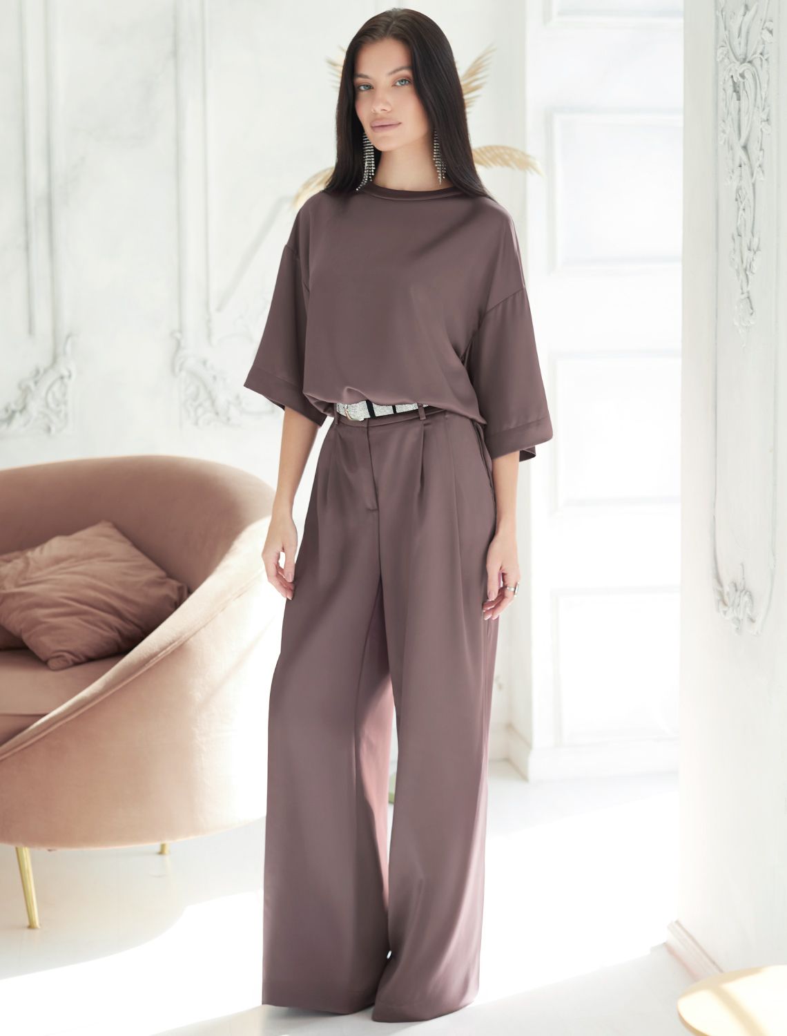 Блузка с короткими рукавами кофейного цвета из струящегося плотного сатина создана для ценительниц комфорта и элегантности. Материал отличается высокой плотностью, что делает блузку устойчивой к износу и сохраняет аккуратный внешний вид даже при длительном использовании. Струящаяся ткань элегантно ложится по фигуре, подчеркивая достоинства силуэта без лишней утяжеленности, в тоже время приятно ощущается на теле.