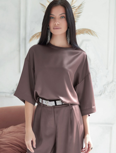 Блузка с короткими рукавами кофейного цвета из струящегося плотного сатина создана для ценительниц комфорта и элегантности. Материал отличается высокой плотностью, что делает блузку устойчивой к износу и сохраняет аккуратный внешний вид даже при длительном использовании. Струящаяся ткань элегантно ложится по фигуре, подчеркивая достоинства силуэта без лишней утяжеленности, в тоже время приятно ощущается на теле.