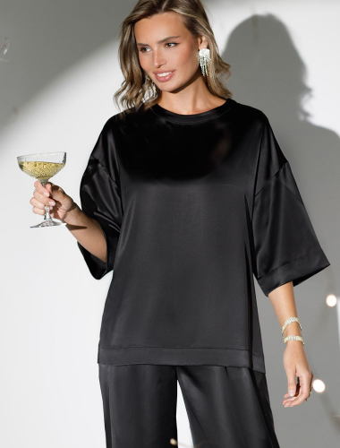 Блузка смотрится нарядно благодаря сочетанию мягкой текстуры сатина и его мягкого не вычурного блеска. Такая повседневная блузка легко впишется в деловой гардероб или станет отличным выбором для вечерней встречи с друзьями. Она гармонично сочетается с юбками, брюками или джинсами — вы сможете создать множество вариантов нарядов на каждый день или подобрать подходящий лук для особого случая, праздника или Нового года.