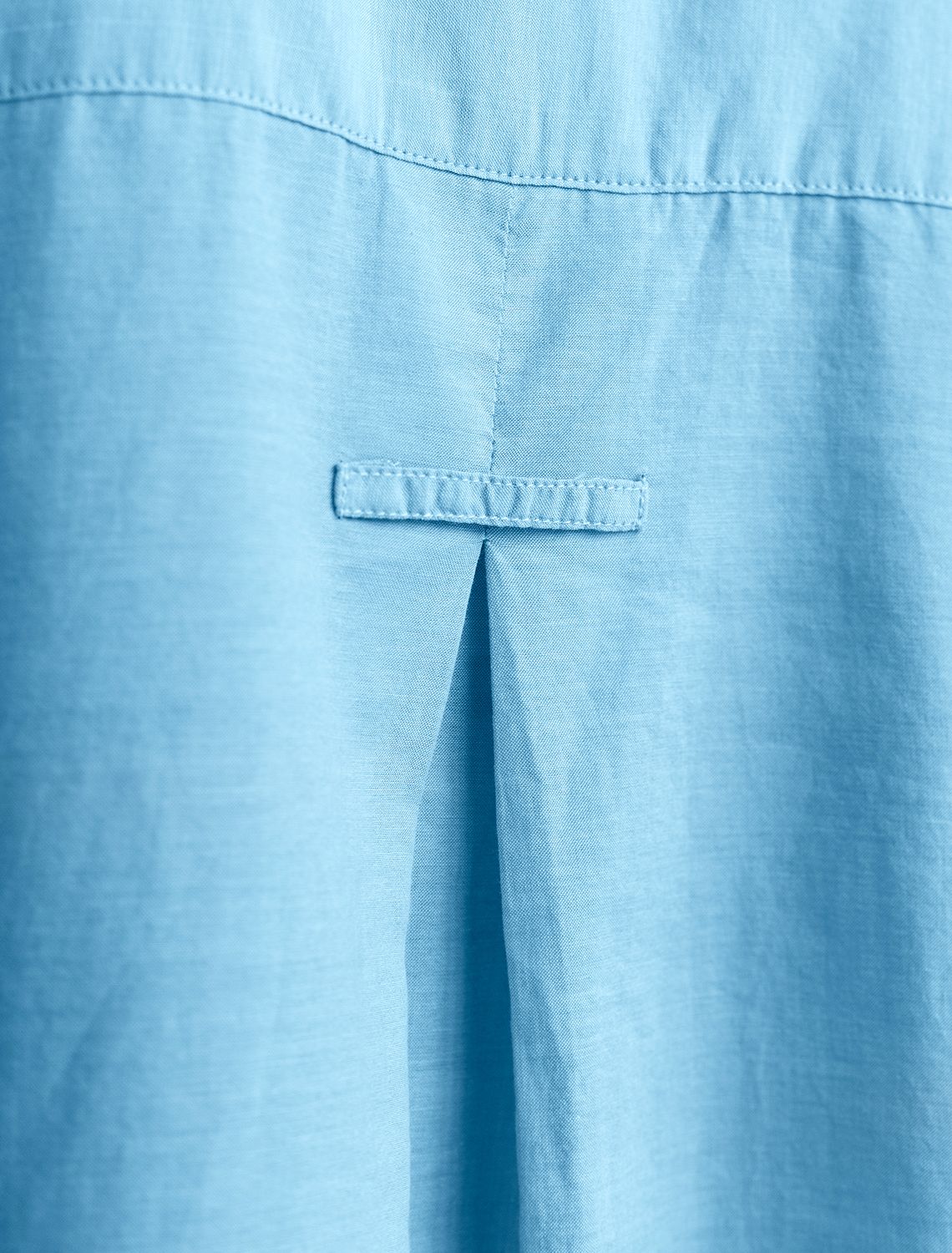 Свободная блузка лазурно-голубого цвета с отложным воротником из хлопка станет отличным выбором для тех, кто ценит комфорт и стиль. Благодаря натуральной ткани, блузка приятная к телу и подходит для ежедневной носки. Материал — 100% хлопок — гарантирует хорошую воздухопроницаемость и ощущение свежести даже в жаркие дни. Удлиненный крой создает современный силуэт, который отлично смотрится в повседневных образах. Базовая модель легко впишется в любой гардероб и станет универсальным решением для самых разных случаев.Ткань держит форму после стирки, что делает уход за вещью простым и удобным. Карман на груди добавляет функциональности и делает образ более интересным. Натуральная структура материала не раздражает кожу, а сама блузка освежает внешний вид благодаря своему лаконичному дизайну и приятной расцветке.